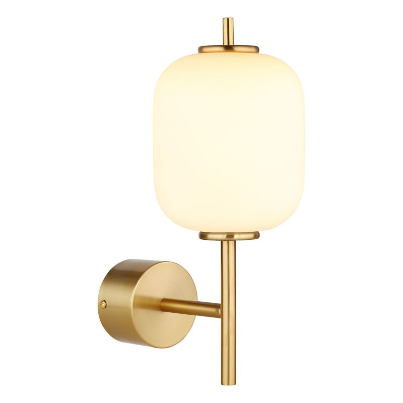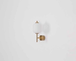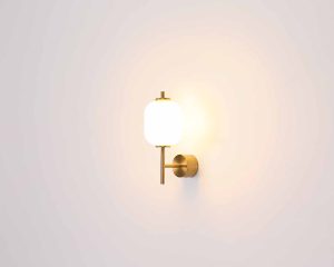 Esta lámpara de pared tiene un ancho de 135 mm, una altura de 290 mm y una distancia a la pared de 190 mm. Fabricada en metal color latón y vidrio opalino, ofrece un brillo dirigido hacia arriba con una luminosidad de 600 lm (3000K). Perfecta para cualquier habitación.