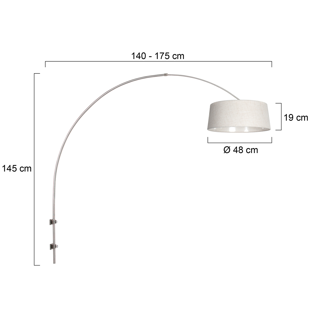 Esta lámpara de pared en color acero de la serie Sparkled Light combina un diseño moderno con funciones prácticas. La lámpara está fabricada en acero inoxidable cepillado y equipada con un casquillo E27 ajustable, compatible con todo tipo de fuentes de luz de hasta 40 vatios. La altura del accesorio es de 145 centímetros y el gran arco se puede ajustar en profundidad de 115 a 160 centímetros. La lámpara se entrega con un cable de 200 centímetros que incluye un interruptor de encendido/apagado, lo que te permite colocarla de manera flexible sin necesidad de una conexión directa a la pared.