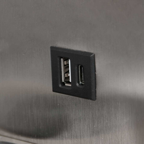La lámpara de pared en color acero de la serie Upround cuenta con un cargador de teléfono inalámbrico integrado y conexiones USB-A y USB-C, lo que la hace aún más práctica. La lámpara se entrega con una fuente de luz GU10 con función de atenuación a cálido, permitiéndote ajustar el color de la luz entre 2200K y 2700K para crear un ambiente cálido o brillante.