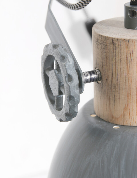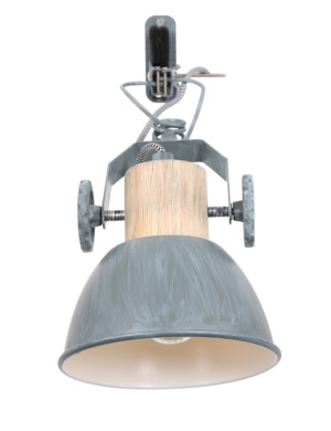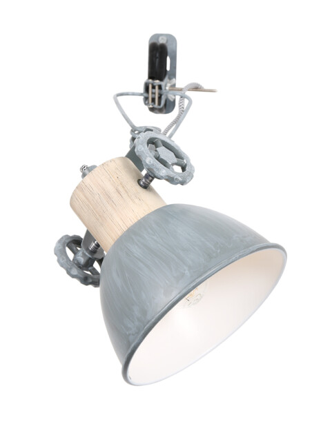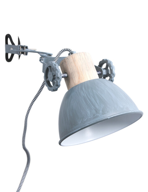 Nos gustaría recomendarte este foco industrial con pinza. Una lámpara llamativa así como práctica. Puedes llevar tu lámpara favorita a cualquier lugar. Se sujeta fácilmente cerca de un enchufe en una mesa o silla. “Gearwood” de Mexlite es una mezcla de madera y metal gris suave. Detalle interesante, presta atención a las ruedas con las que puedes ajustar la lámpara.