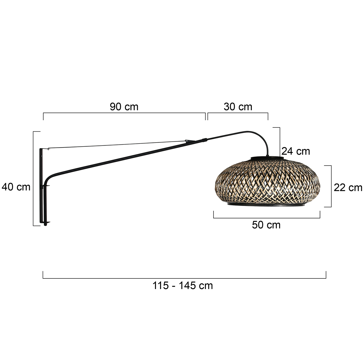 Esta lámpara de pared con un alcance de 115 a 145 cm combina un elegante marco de metal negro con una pantalla de bambú trenzado de 50 cm. Los tonos naturales y negros en la pantalla proporcionan una dispersión de luz cálida y vibrante, además de un aspecto único en la pared.
