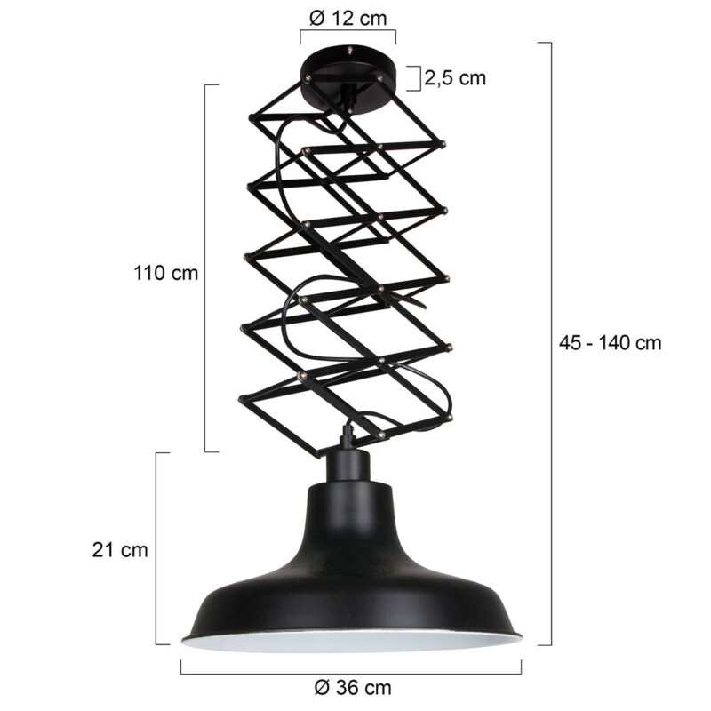 Lámpara de brazo articulado negra industrial de la serie Flex, perfecta para quienes buscan una solución de iluminación única y funcional. La lámpara cuenta con un mecanismo extensible que permite ajustar la altura hasta 140 cm. La pantalla, con un diámetro de 36 cm y una altura de 21 cm, es inclinable para un control óptimo de la luz. Compatible con fuentes de luz E27 de hasta 40 vatios y suministrada con un cable de 110 cm.
