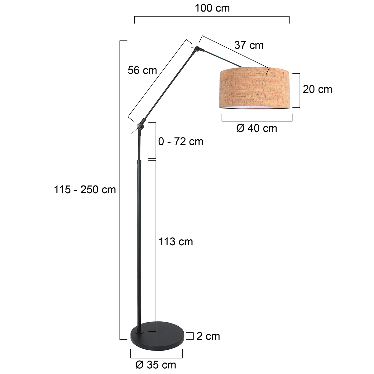 Esta gran lámpara de arco negra de la serie Prestige Chic está equipada con una amplia pantalla redonda de corcho de 40 centímetros de ancho y 20 centímetros de alto. La elegante estructura negra es ajustable, lo que te permite mover la luz fácilmente al lugar deseado. El casquillo E27 inclinable asegura que la pantalla siempre cuelgue recta y el cable de 220 centímetros con interruptor de pie facilita aún más su manejo.