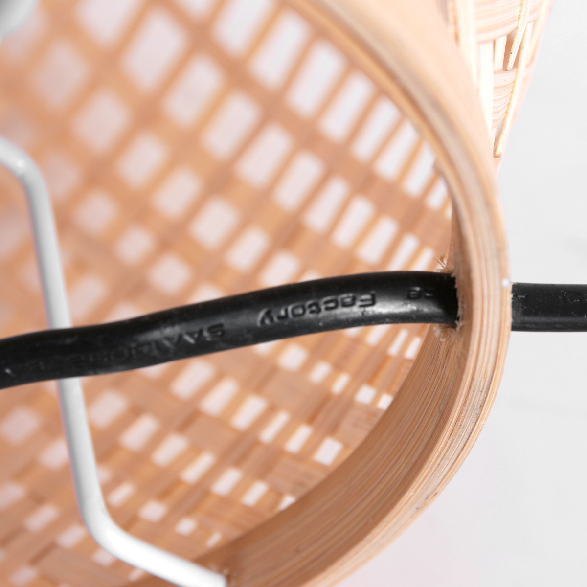 La iluminación atmosférica para la mesa o una mesa baja la obtienes con la lámpara de mesa de bambú. La fuente de luz está fijada en la parte inferior de la lámpara. Esto crea un efecto de luz especial, incluso cuando la lámpara está en una mesa baja, lo que se enfatiza aún más por los agujeros en el trenzado. Esta lámpara se adapta bien a un interior retro o natural.