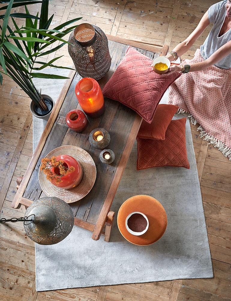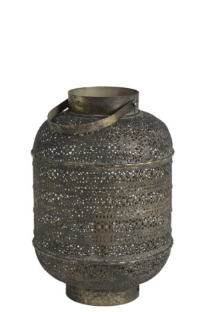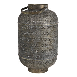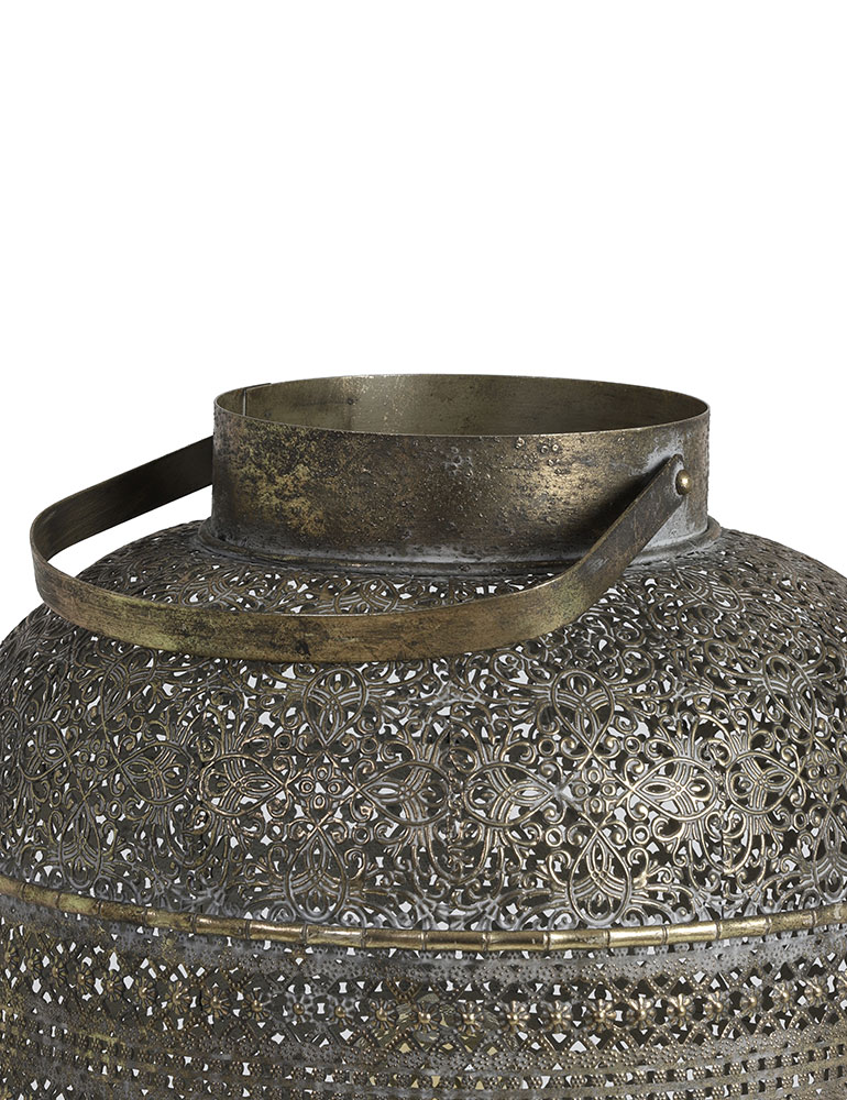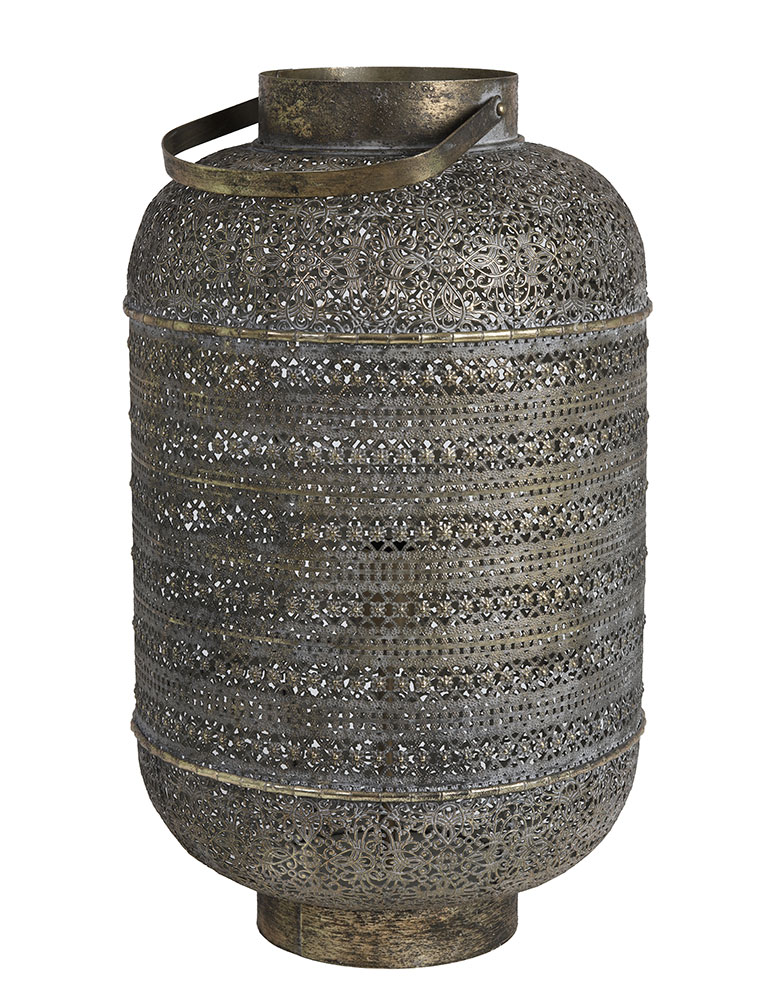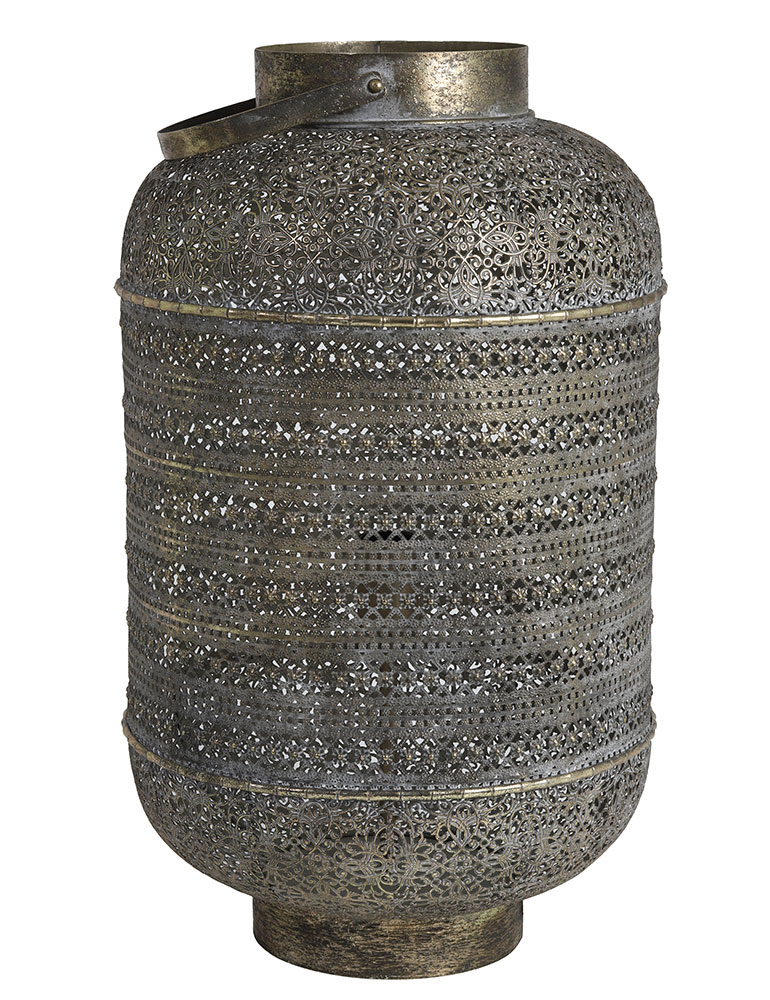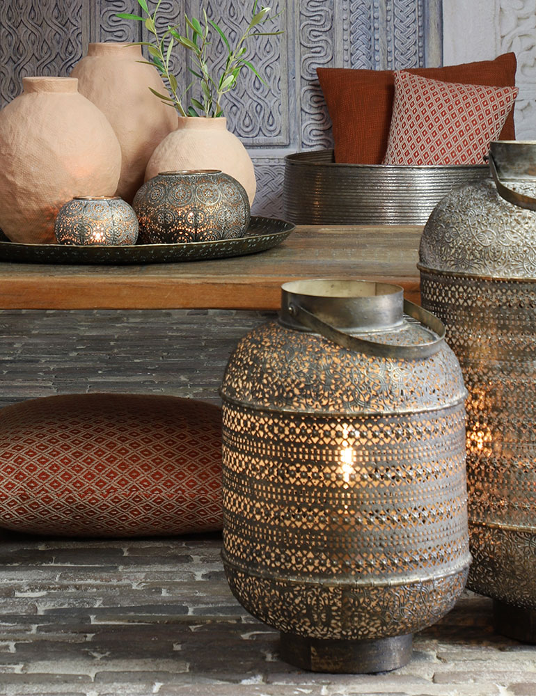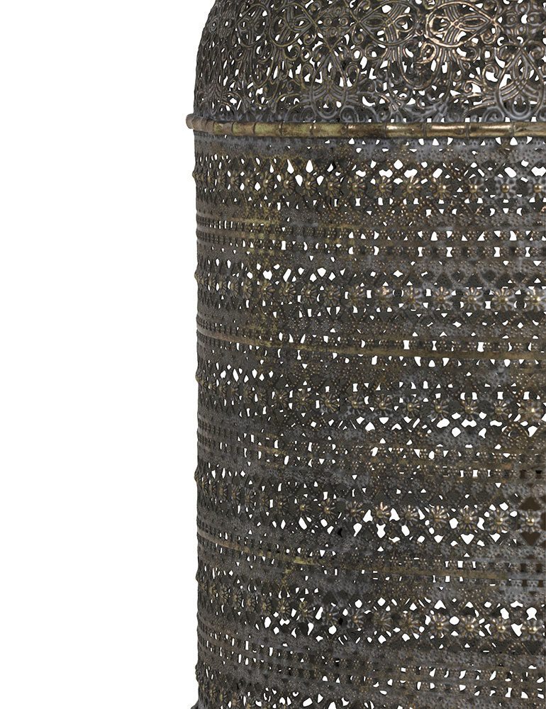 Sugerente y enigmático, este farol evoca la atmósfera de Oriente y presume de una elegancia suave y antigua. Puede colocarse sobre una alfombra oriental, junto a un sofá profusamente adornado con cojines y una mesa de centro de esencia marroquí, situada bajo una lámpara colgante de ratán o de malla metálica dorada con acabado envejecido. El conjunto se verá espectacular.
