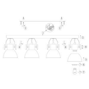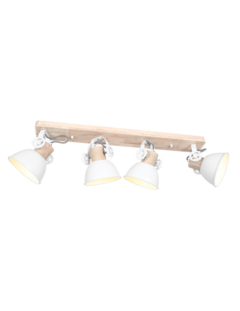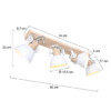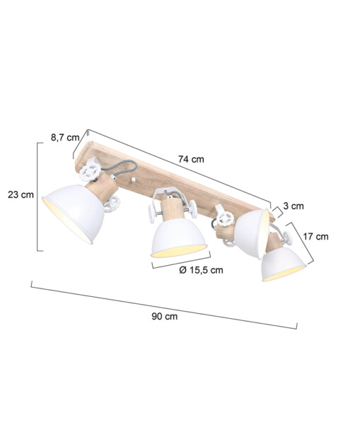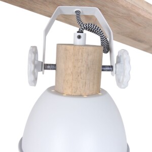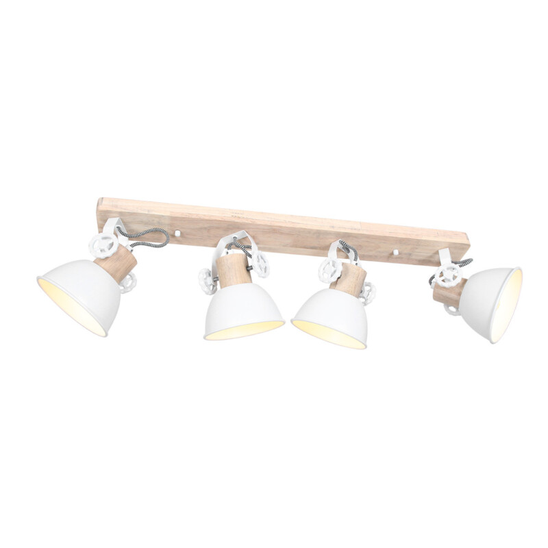 El foco de techo de 4 luces Gearwood de Mexlite tiene un acabado mate blanco con detalles de madera. Los cuatro focos ajustables están equipados con un casquillo E27, adecuado para fuentes de luz de hasta 40 vatios. La longitud total de la lámpara es de 90 cm, con un diámetro de pantalla de 15 cm y una altura total de 19 cm. La lámpara es regulable con un atenuador externo y una fuente de luz adecuada.