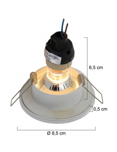 El foco blanco de la serie Pélite está hecho de acero blanco y vidrio y no es inclinable. La lámpara tiene un casquillo GU10 y es adecuada para bombillas de hasta 40 vatios (no incluidas). Con el sistema de resortes de sujeción, este foco es fácil de instalar. La altura del foco empotrable es de 3,5 cm, de los cuales 0,5 cm sobresalen. El diámetro de empotrado es de 65 mm. Gracias a la clasificación IP44, este foco es adecuado para la zona 2 del baño. La lámpara es regulable con un regulador externo y una bombilla adecuada (no incluida).