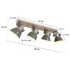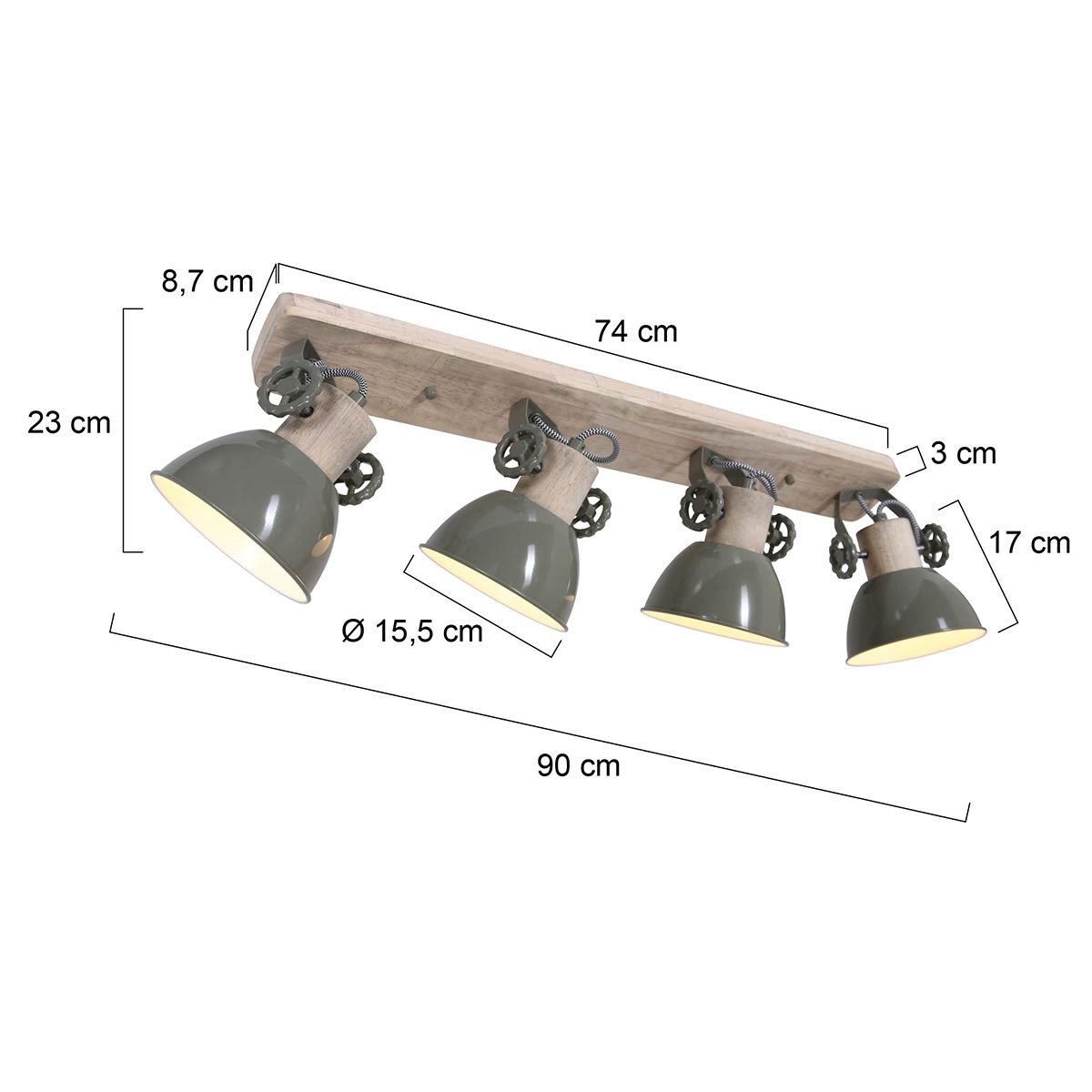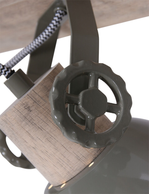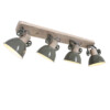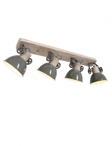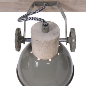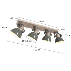 El foco de techo Gearwood de 4 luces de Mexlite tiene un aspecto industrial con una combinación de madera y metal. Los cuatro focos ajustables tienen un casquillo E27, adecuado para fuentes de luz de hasta 40 vatios. La longitud total del foco es de 90 cm y las pantallas tienen un diámetro de 15 cm. La lámpara es regulable con un regulador externo y una fuente de luz adecuada. Disponible en verde, gris y blanco.