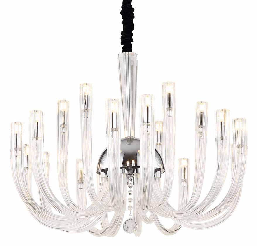 Esta pieza de exhibición, una lámpara colgante, aporta pura elegancia a su interior moderno con su marco de metal cromado y varillas de vidrio iluminadas. Cubierta con una refinada cadena de terciopelo negro, la lámpara tiene un tamaño impresionante de 720 mm de diámetro y 1200 mm de altura. Tenga en cuenta que la compra es exclusiva de las 18 bombillas G9 necesarias, que pueden tener una potencia máxima de 7 W y un voltaje de 230 V. Además de su apariencia llamativa, esta lámpara está diseñada para integrarse sin problemas en cualquier espacio.
