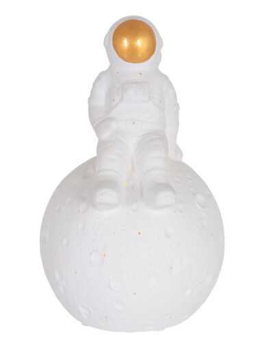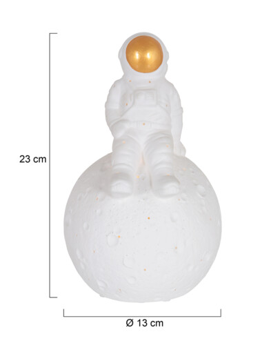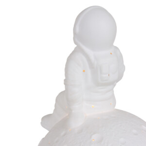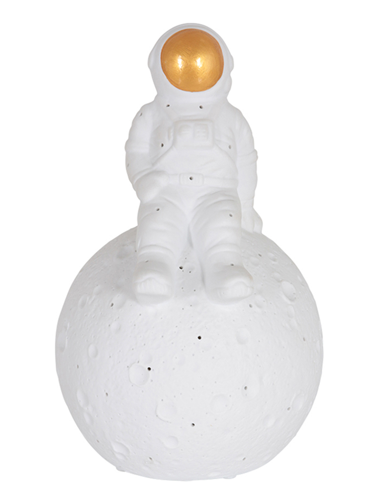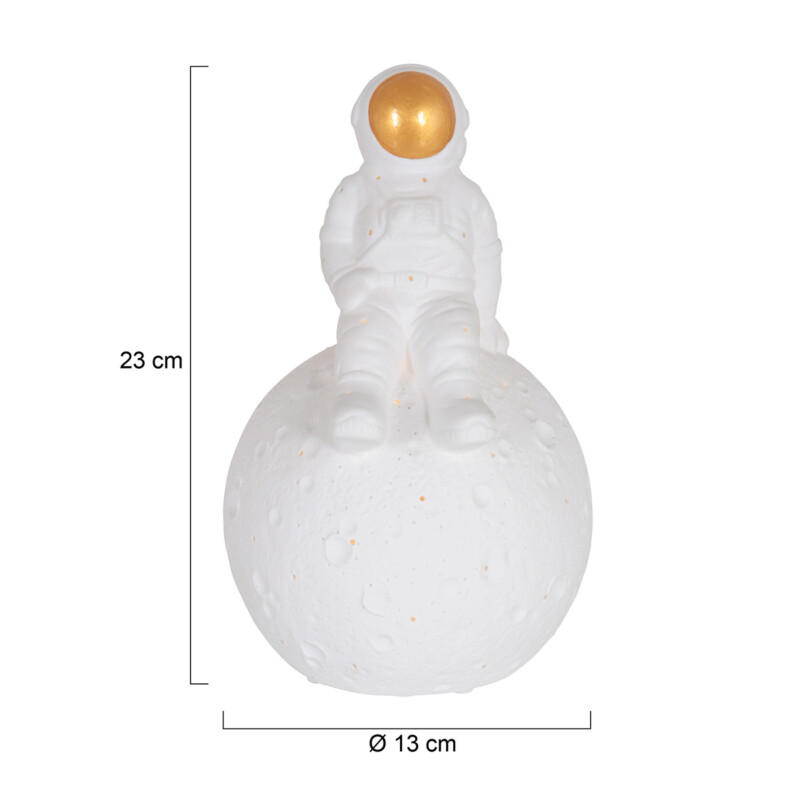 La lámpara de mesa Jazz aporta un ambiente juguetón y mágico a tu hogar. Esta figura de cerámica muestra a un astronauta sentado sobre un globo terráqueo con un visor dorado. Equipado con un casquillo E14 y un práctico interruptor de encendido/apagado en el cable. Con una altura de 23 cm y un diámetro de 13 cm, esta lámpara es una adición única a un escritorio o mesita de noche.