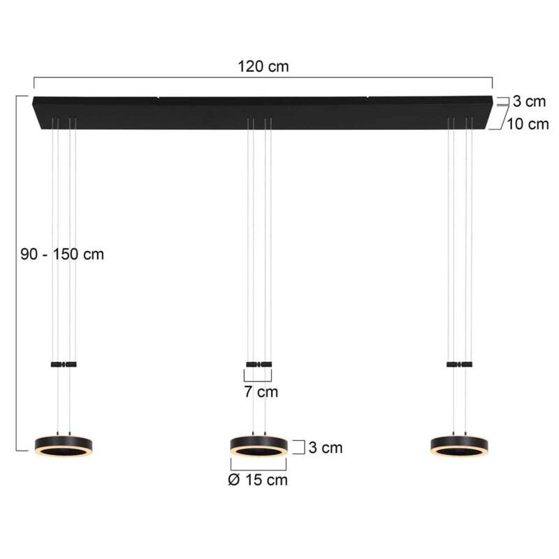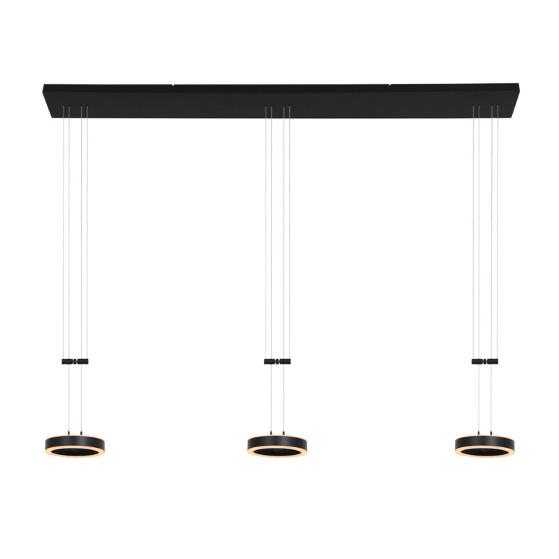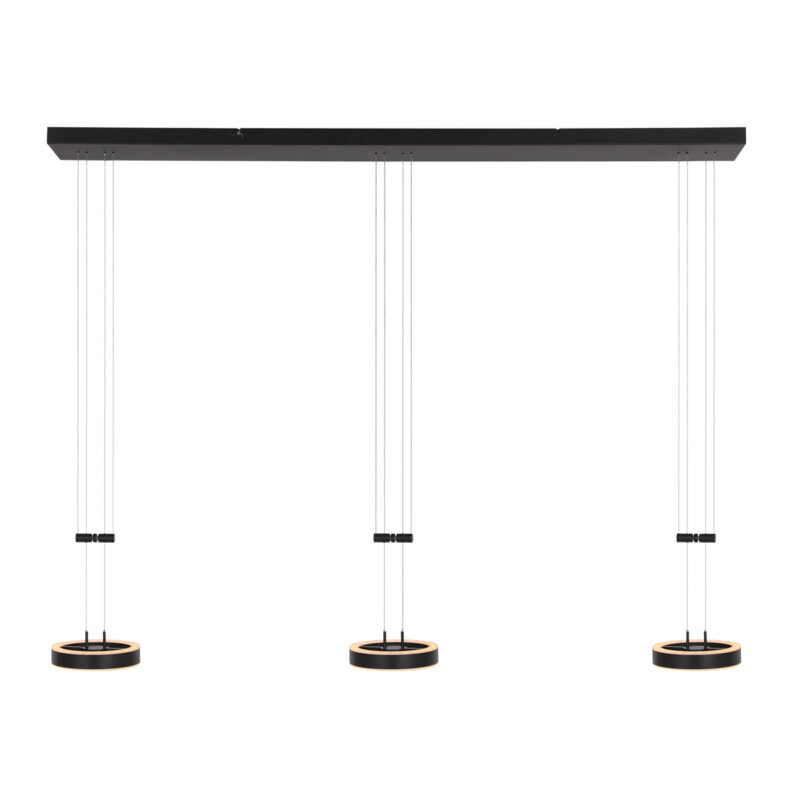 La lámpara tiene tres puntos de luz que iluminan tanto hacia arriba como hacia abajo, creando una distribución de luz equilibrada. Con un ancho de 130 cm y una altura ajustable, es adecuada para diversos espacios. Gracias a la función de atenuación y a una temperatura de color de 2700 Kelvin, puedes ajustar fácilmente el ambiente. Un añadido elegante y versátil a tu interior.