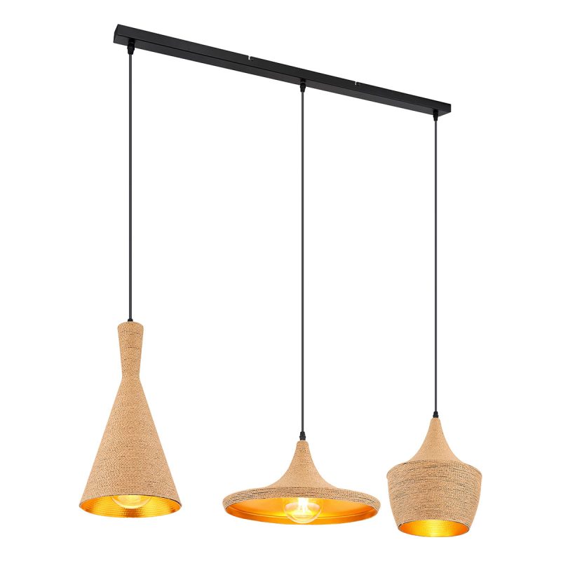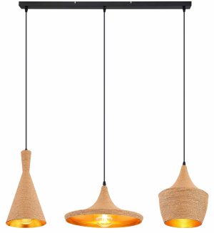 <pEsta lámpara colgante de la serie Ludmilla es ideal para tu salón o comedor. La lámpara colgante de 107 cm de largo consta de tres pantallas de aluminio dorado de diferentes formas, que están cubiertas por fuera con tejido marrón. Estas se pueden equipar con bombillas E27 de tu elección, lo que te permite determinar individualmente el color y la intensidad de la luz. Además, la altura de la lámpara colgante se puede ajustar hasta 140 cm durante la instalación. Con otros modelos de la misma serie, puedes actualizar tu interior con estilo.