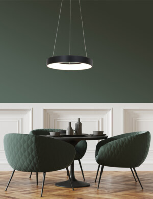 El diseño del anillo de la línea de lámparas colgantes LED Ringlede de Steinhauer se presenta, en este caso, en color negro. Combina con espacios minimalistas o modernos. Esta lámpara luce genial sobre una mesa de comedor redonda negra, rodeada de sillas de polipropileno blancas y negras o sillas tapizadas de última generación. Puede combinarse con apliques LED minimalistas negros.