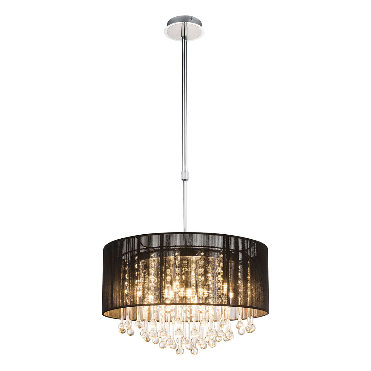 Esta lujosa lámpara de techo redonda de la serie Bagana, cubierta con seda negra y adornada con brillantes cristales de vidrio, ofrece un diseño llamativo. Con un diámetro de 50 cm y una altura ajustable de 75-115 cm, esta lámpara proporciona una cálida tonalidad de luz de 3000K. Las doce bombillas LED de 3W son reemplazables. Combínala con otros modelos para una decoración completa.