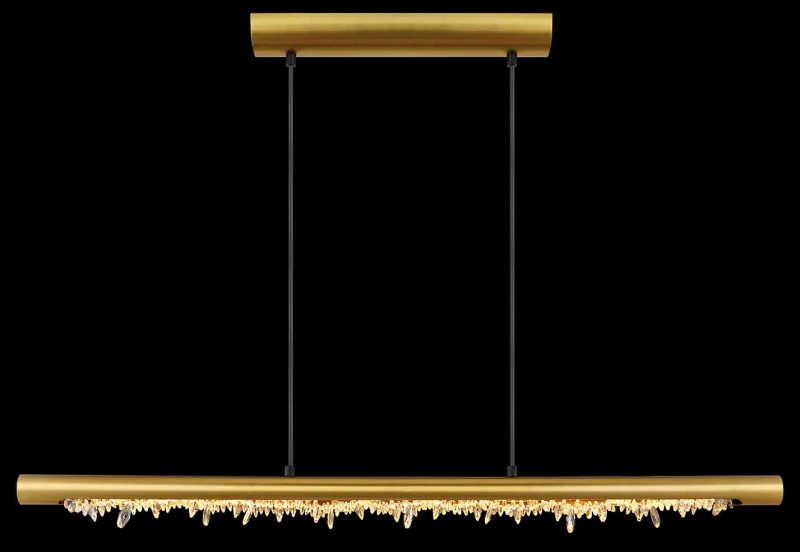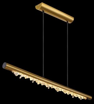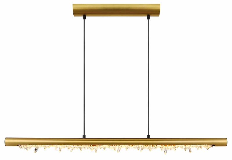 Esta lámpara colgante de la serie Felicitas (100×8 cm) tiene un diseño sencillo de metal color latón. La barra metálica presenta en la parte inferior hermosos cristales de acrílico y cuelga hasta 150 cm del techo mediante dos cables. Estos cubren las lámparas LED incluidas, que emiten 980 lúmenes de luz con un cálido color de 3000 Kelvin.