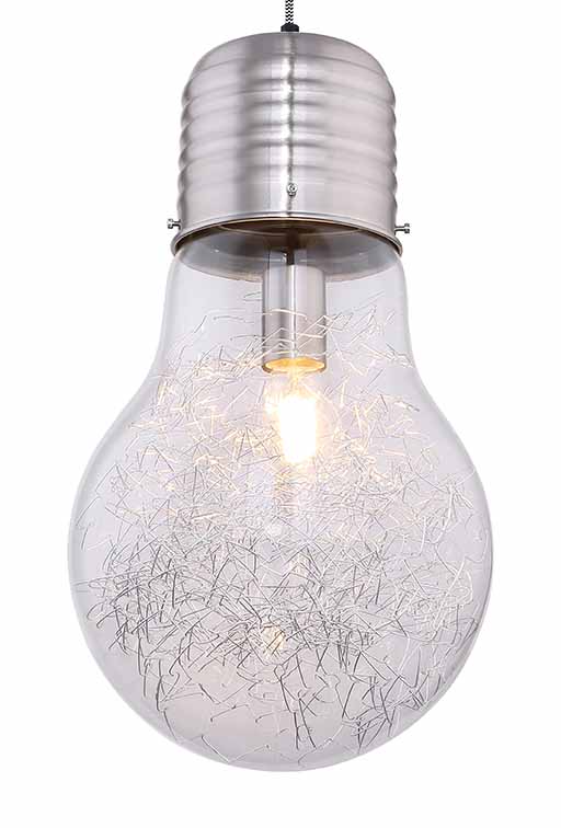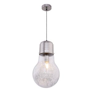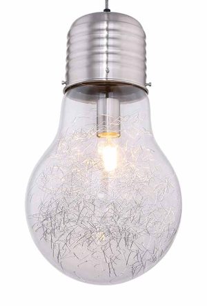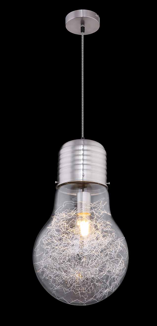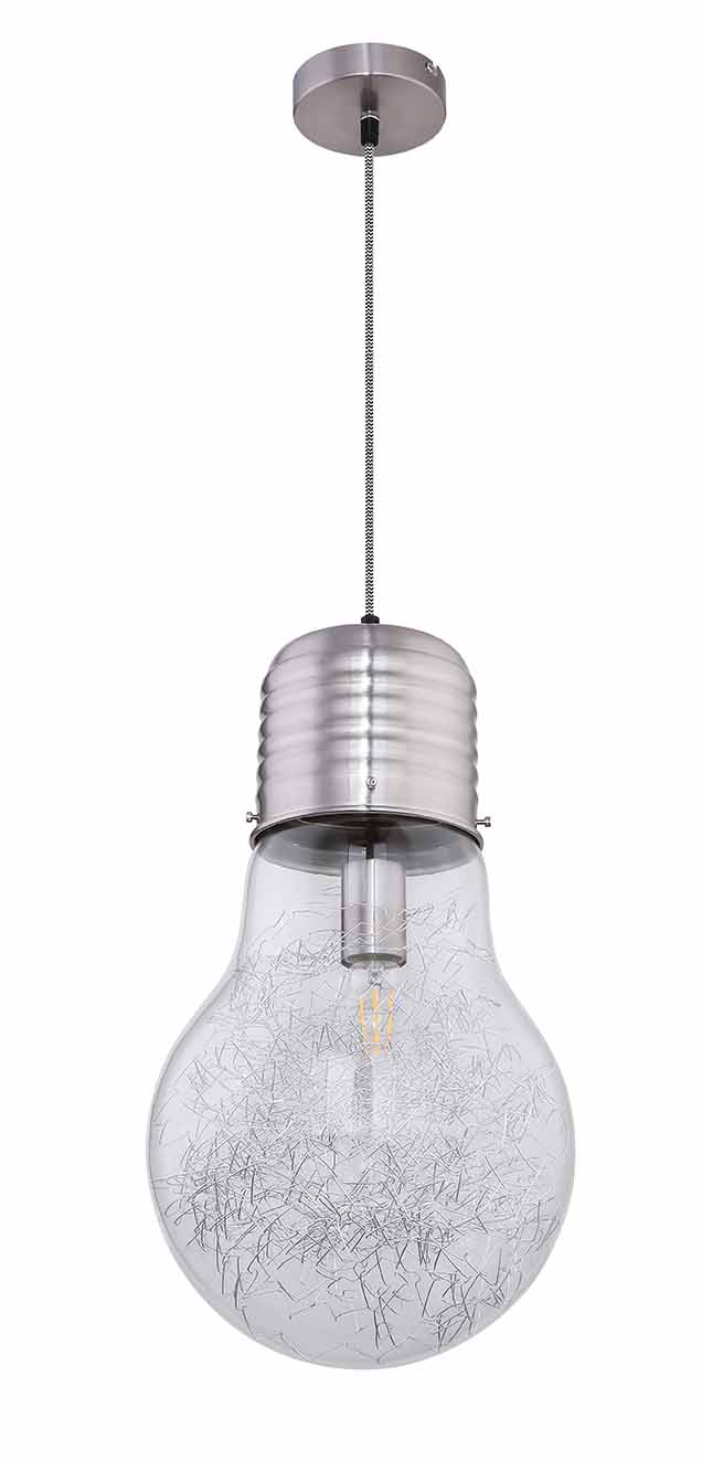 Toledo, una lámpara de techo de 1,35 m de altura, destaca en cualquier espacio con su suspensión en níquel mate y una simulación de bombilla cristalina de casi 28 cm de ancho. Un elemento de diseño llamativo, perfecto para interiores modernos.