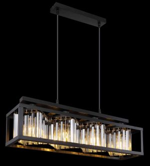Esta hermosa lámpara de techo inspira con su maravilloso diseño y se convierte en un punto focal en cualquiera de sus habitaciones. Compuesta por una jaula rectangular mate negra (68×17 cm) con una gran cantidad de varillas de vidrio en su interior, la lámpara tiene una altura de 1,2 m. Cuatro conexiones E27 le permiten elegir la bombilla con una potencia máxima de 40 vatios. Establezca acentos.