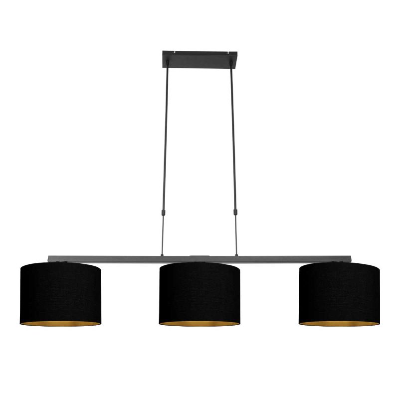 La lámpara colgante de 3 luces Stang de Steinhauer combina un diseño moderno con un acabado elegante. El esbelto armazón negro tiene un ancho de 140 cm y es ajustable en altura entre 85 y 155 cm, lo que permite que la lámpara se adapte a diferentes espacios. Los tres casquillos E27 ofrecen flexibilidad en la elección de las fuentes de luz. Se entrega con tres pantallas de lino negro y dorado de 30 cm, lo que proporciona una iluminación cálida y acogedora. Incluye 2 años de garantía de fábrica.