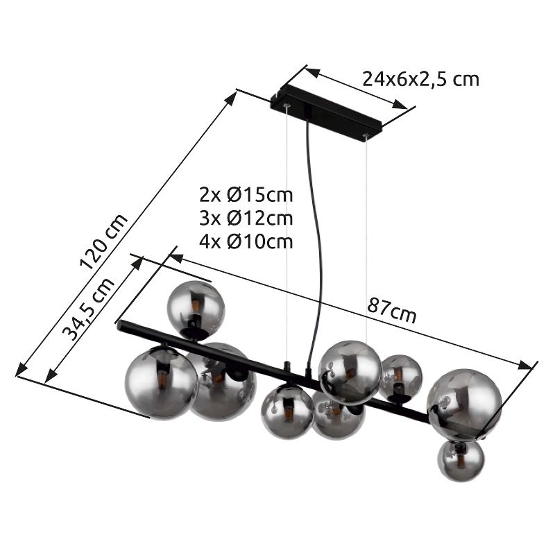 Esta impresionante lámpara de vidrio colgante es una verdadera adquisición para su interior. Con una longitud de 86 cm y una altura de 1,2 metros, esta lámpara tiene una apariencia imponente que atrae la atención y provoca admiración en cada espectador. La lámpara está equipada con nueve esferas de vidrio elegantemente diseñadas que, juntas, forman un conjunto brillante gracias a su superficie brillante. Esta lámpara colgante es especialmente adecuada para su comedor, donde no solo proporciona una iluminación atmosférica, sino que también crea una ambiente única.