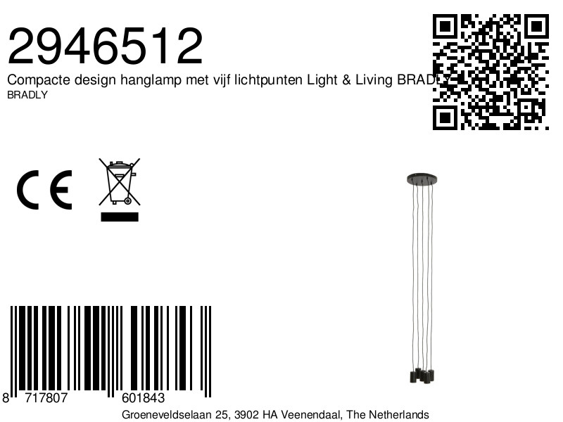La lámpara colgante BRADLY de Light & Living tiene una forma redonda con cinco puntos de luz y un acabado moderno en negro mate. El diseño metálico abierto crea un efecto de luz juguetón en el espacio. La lámpara tiene un diámetro de 35 cm y una altura de 7 cm, siendo ideal para sobre una pequeña mesa de comedor o un rincón de estar.