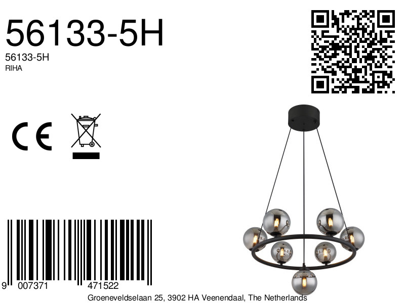 La lámpara colgante RIHA, con su elegante diseño de anillo y cinco esferas de vidrio ahumado, ofrece una solución de iluminación refinada que se adapta perfectamente a los interiores modernos. El marco de metal negro, en combinación con la única iluminación Up & Down, crea una atmósfera elegante en cualquier espacio. Con una impresionante salida de luz de 130 lúmenes y una agradable temperatura de luz de 3000 K, esta lámpara es sumamente adecuada para comedores y salas de estar modernas donde se desea una iluminación chic.