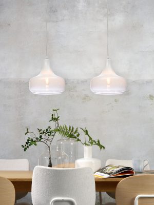 Lámpara colgante escandinava blanco-vidrio metal, It’s About RoMi Reikiavik. Ideal para el comedor, oficina (en casa), dormitorio o sala de estar. Equipado con casquillo E27 y a prueba de polvo (IP20). Fuente de luz no incluida. Agrega un toque moderno a tu interior con esta elegante lámpara.