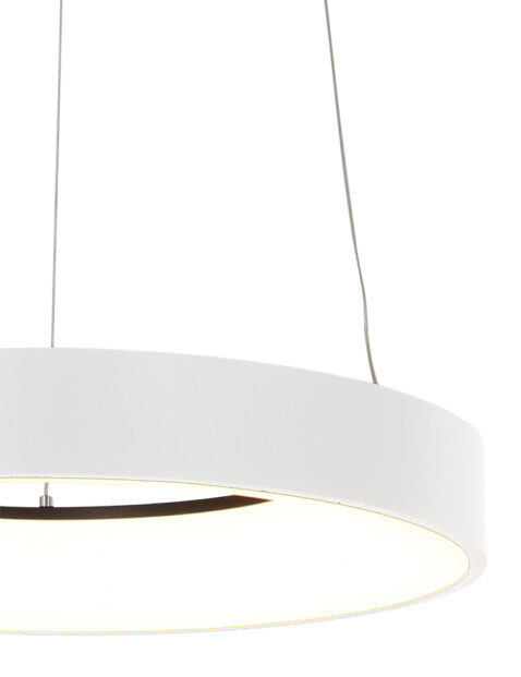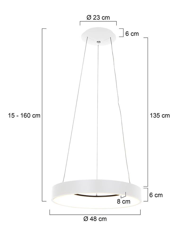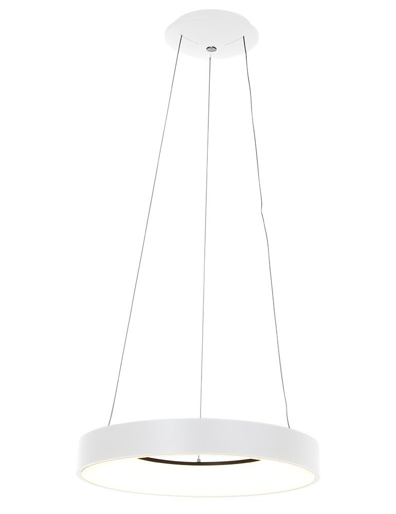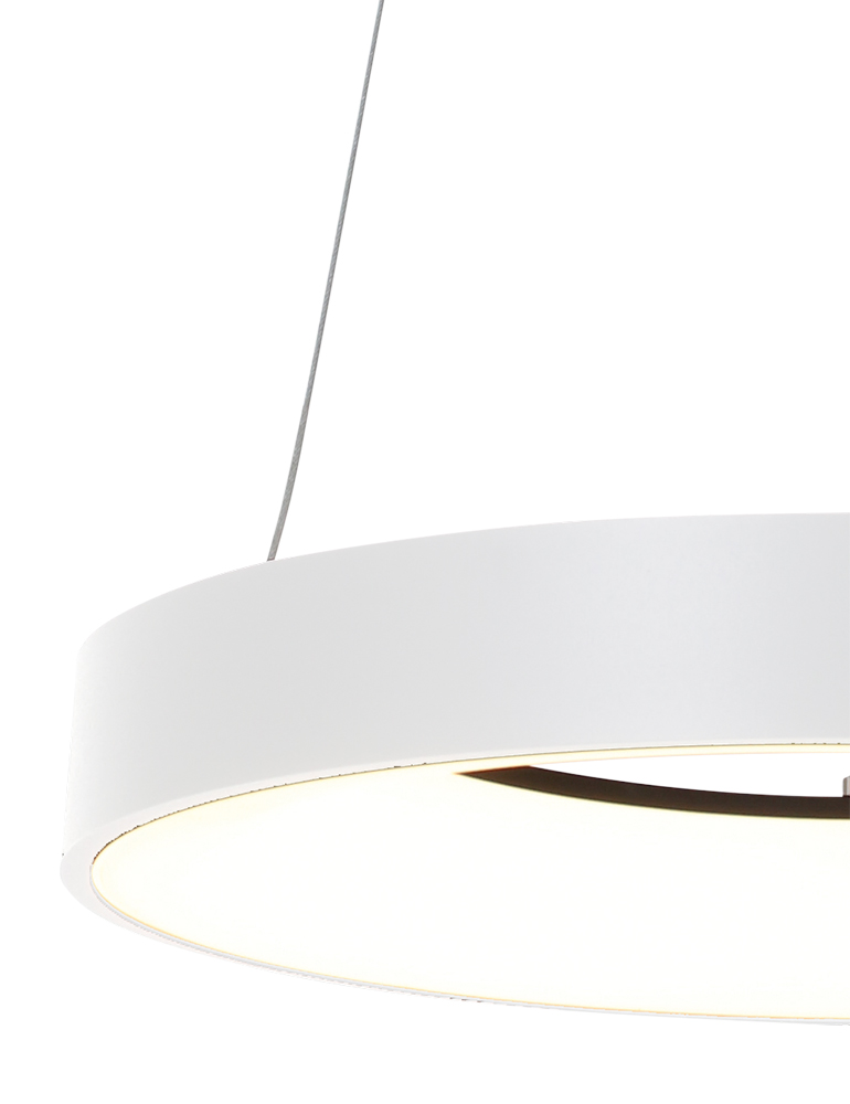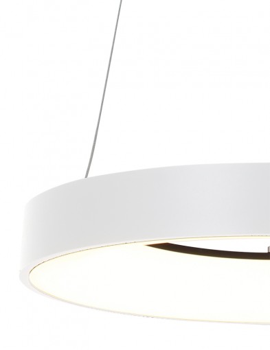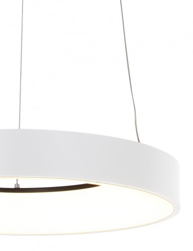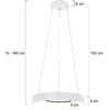 La lámpara colgante blanca de la serie Ringlede está equipada con un módulo LED de 30 vatios reemplazable. La temperatura de color es de 2700 Kelvin con una salida de luz de 3600 lúmenes. La lámpara es regulable con un atenuador de pared externo (no incluido). Durante la instalación, se puede ajustar en altura de 15 cm a 160 cm. El anillo de luz tiene un diámetro de 48 cm y una altura de 6 cm.