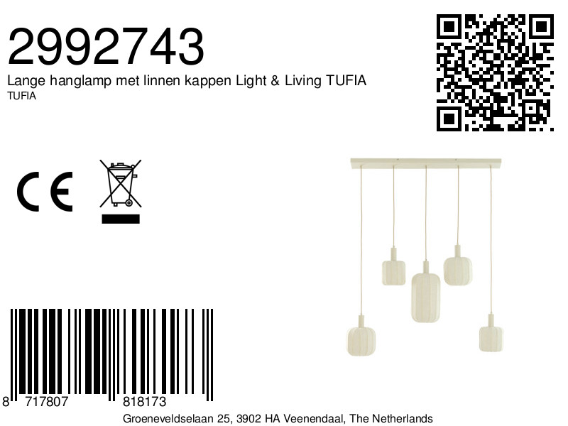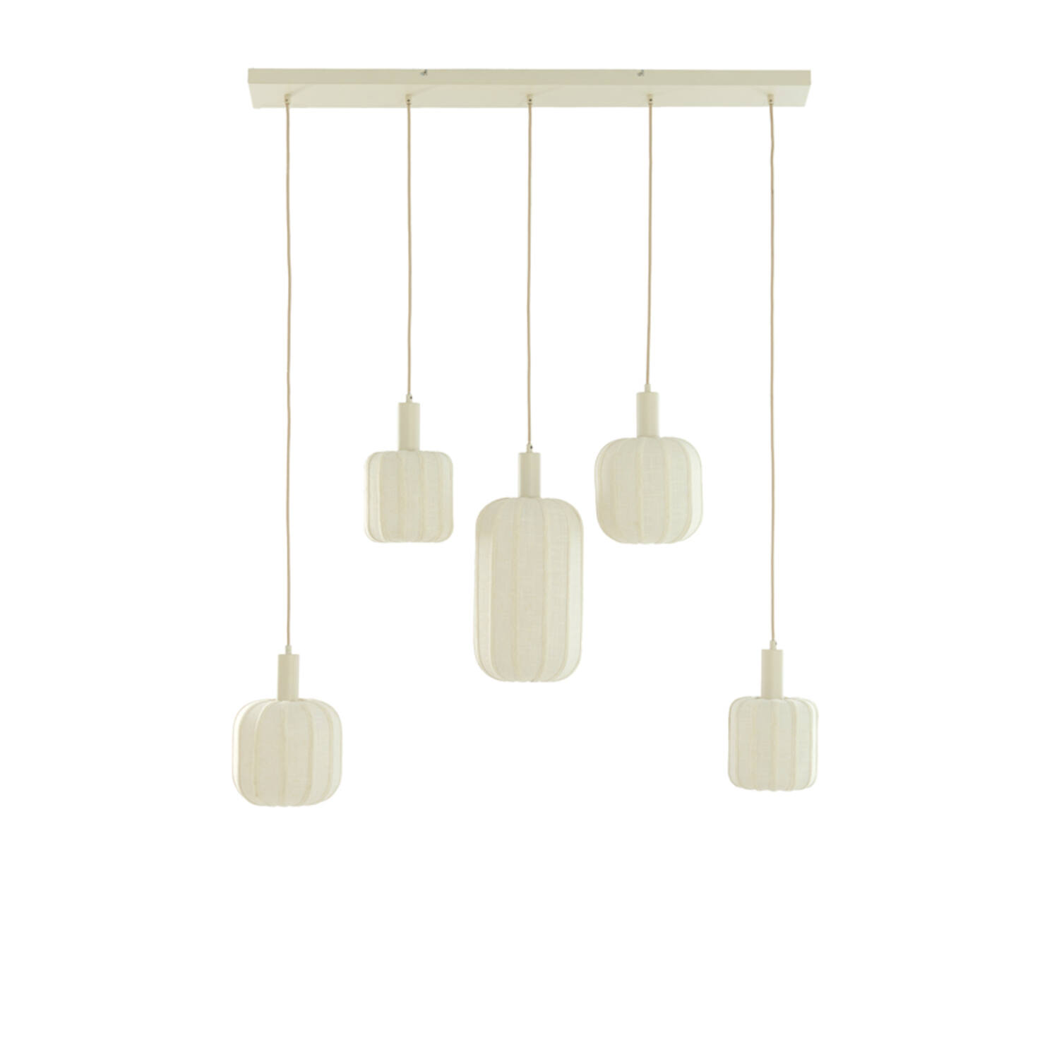 La lámpara colgante TUFIA de Light & Living tiene un diseño alargado con cinco puntos de luz y elegantes pantallas de lino en un suave color crema. Esto crea una distribución de luz cálida y difusa. La lámpara tiene una longitud de 105 cm, un ancho de 19,5 cm y una altura de 123 cm, y es ideal para encima de una mesa de comedor larga.