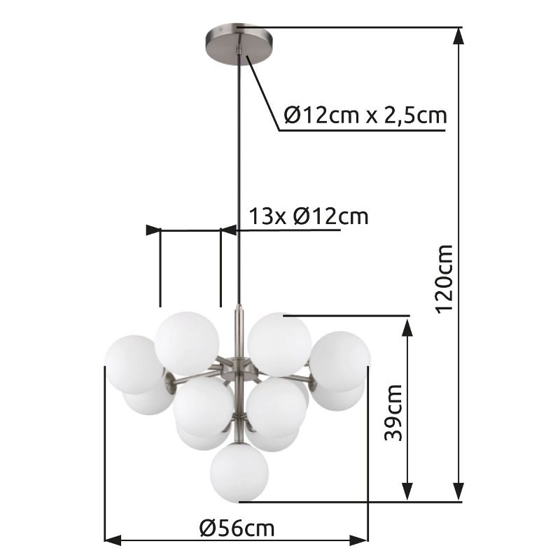 La lámpara colgante Grappy es una lámpara moderna que combina a la perfección la simplicidad y la elegancia con un toque de extravagancia. Esta lámpara tiene un acabado en níquel mate y esferas de vidrio opalino, lo que proporciona un diseño estiloso y atemporal. Con un diámetro de 560 mm y 13 bombillas LED G9 integradas, esta lámpara colgante ofrece una iluminación agradable y brillante para su espacio habitable. Las bombillas LED, cada una con una potencia de 5W, garantizan una eficiente salida de luz y crean una atmósfera acogedora.