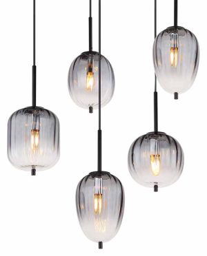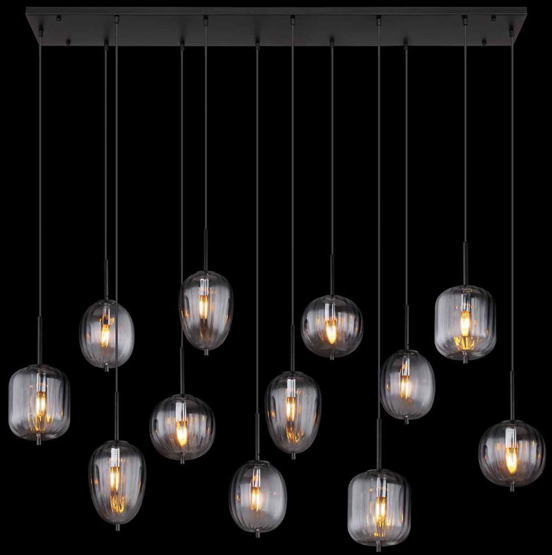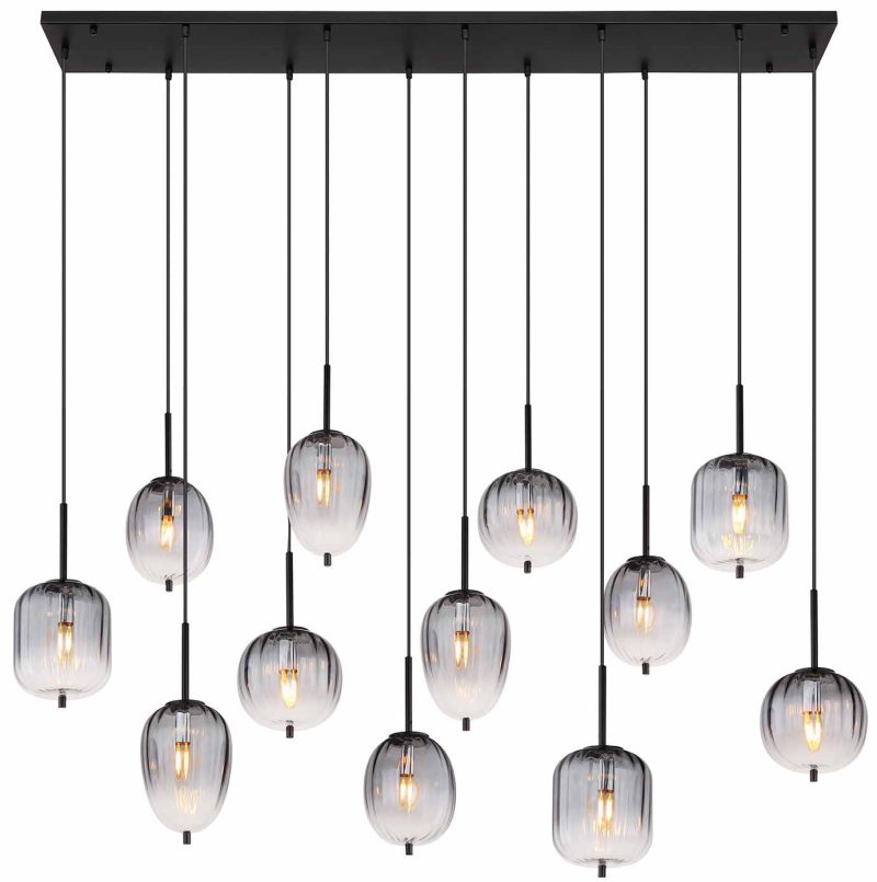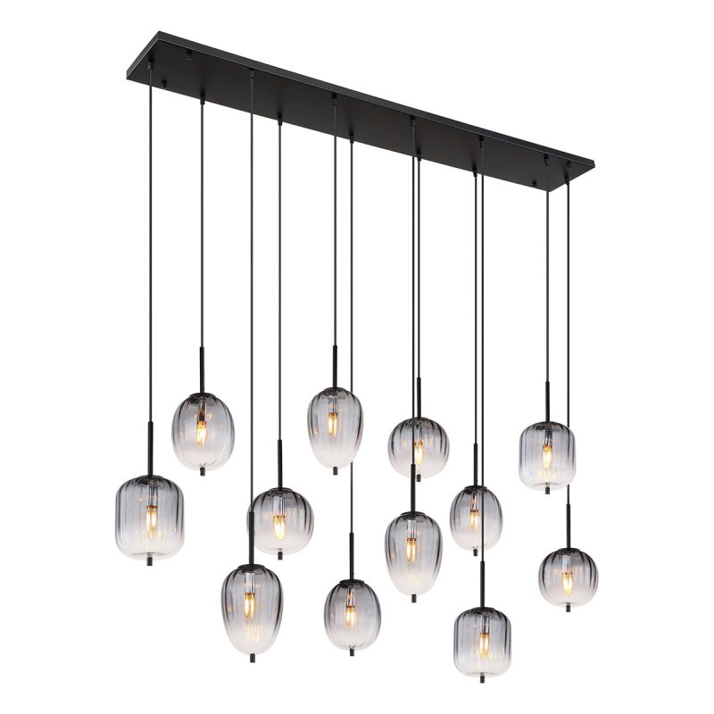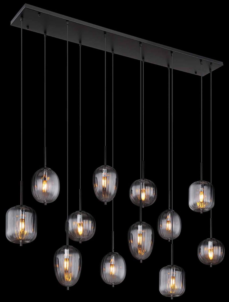 Esta lámpara colgante, con una longitud de 1600 mm y un ancho de 340 mm, está hecha de metal negro mate y vidrio ahumado. El diámetro del cristal varía de 15,8 cm a 18,5 cm. Perfecta para interiores modernos, crea una atmósfera agradable en cualquier habitación.