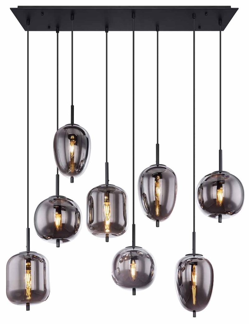 Ilumina tu espacio con estilo con esta lámpara colgante BLACKY de metal negro y vidrio ahumado. Ocho pantallas de vidrio únicas cuelgan de casquillos E14, cada una diseñada para difundir una luz ambiental. Ajustable hasta 40 vatios por bombilla, esta lámpara colgante es perfecta tanto para el ahorro de energía como para una iluminación artística en tu hogar.