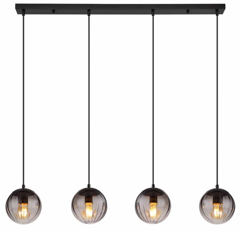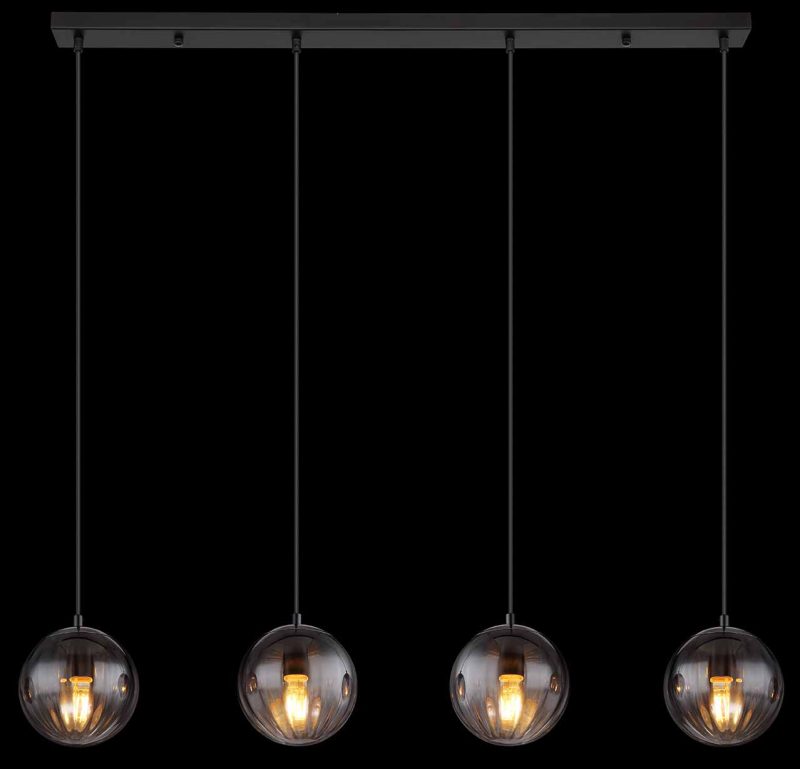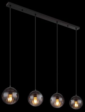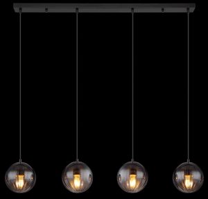 Esta lámpara colgante tiene una longitud de 1040 mm, un ancho de 170 mm y una altura de 1200 mm. Fabricada en metal negro mate y vidrio ahumado, es un elemento de iluminación elegante para cualquier habitación. Requiere 4x E27 60W 230V bombillas (no incluidas).