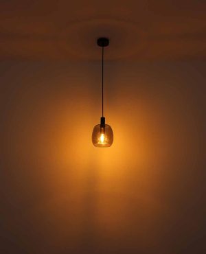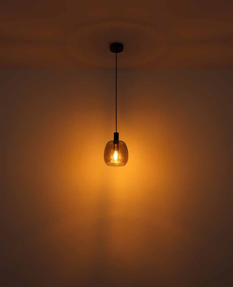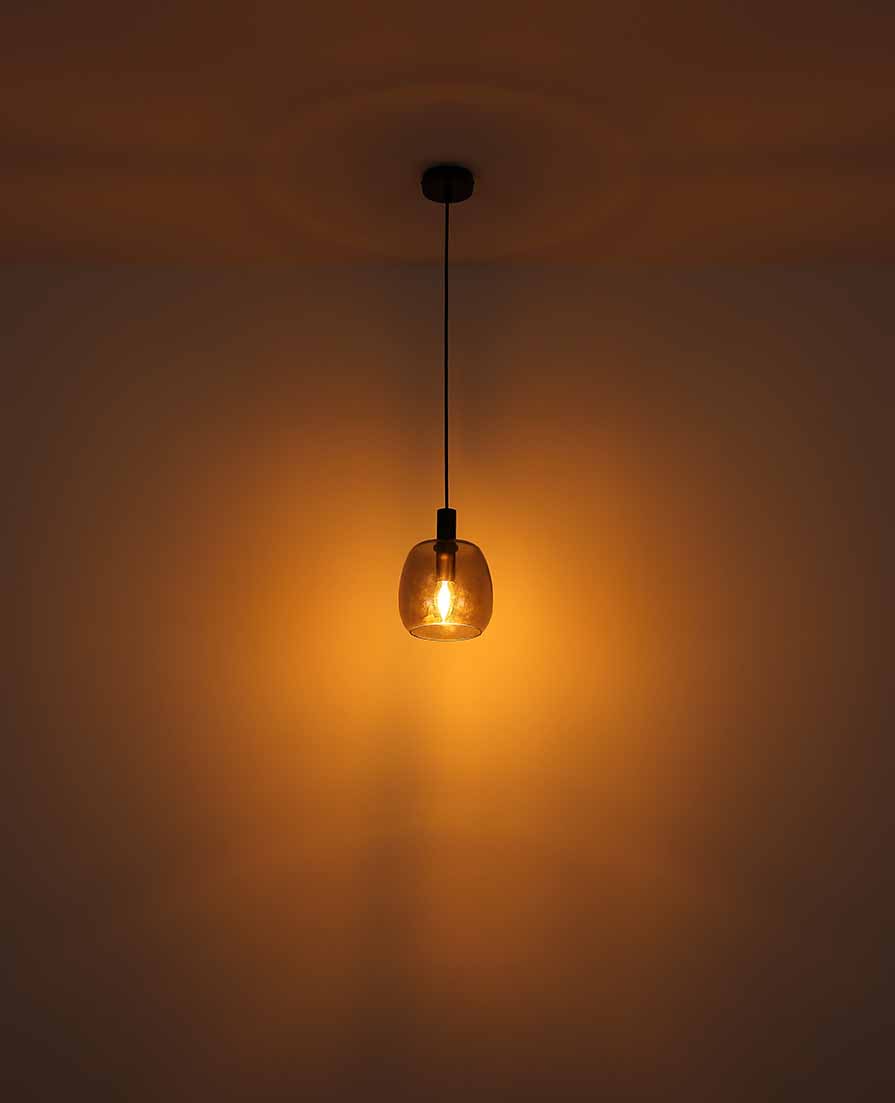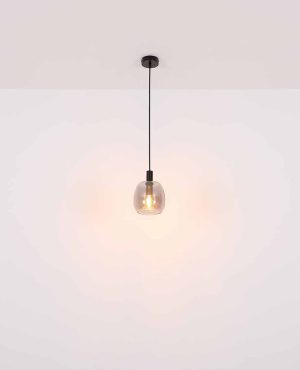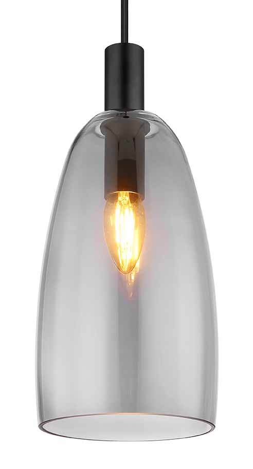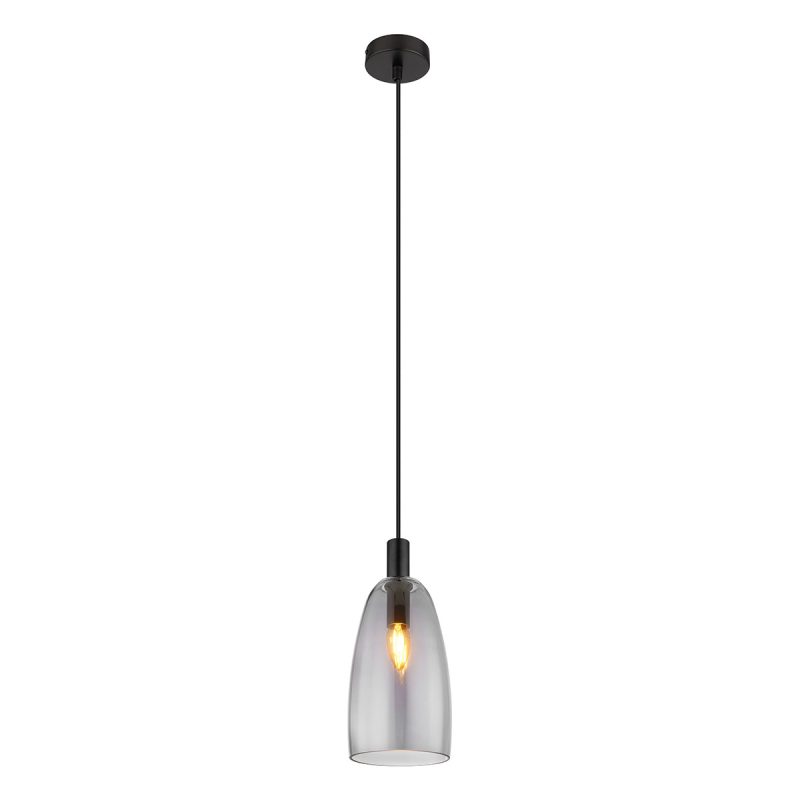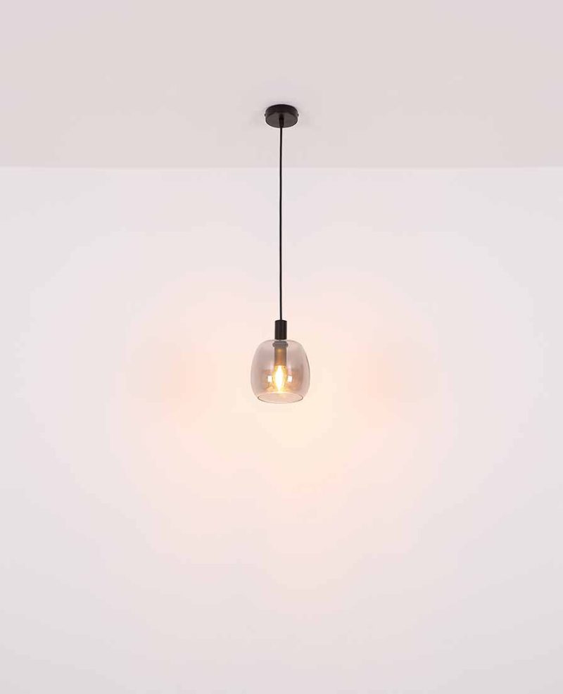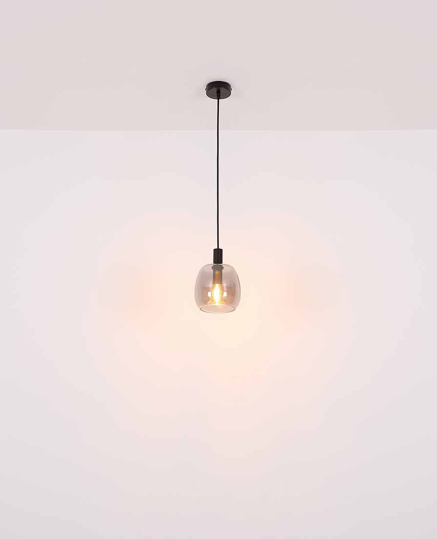 Esta elegante lámpara colgante impresiona con su hermoso diseño. Desde un montaje de techo redondo cuelga un cable negro de 1,2 m de longitud hacia un conector E14, equipado con una pantalla de vidrio ahumado (Ø 14 cm) y decoraciones negras. Puede ajustar el color de la luz y el brillo según sus deseos hasta una potencia máxima de 40 vatios. Para el ahorro de energía y una larga vida útil, se recomiendan lámparas LED.