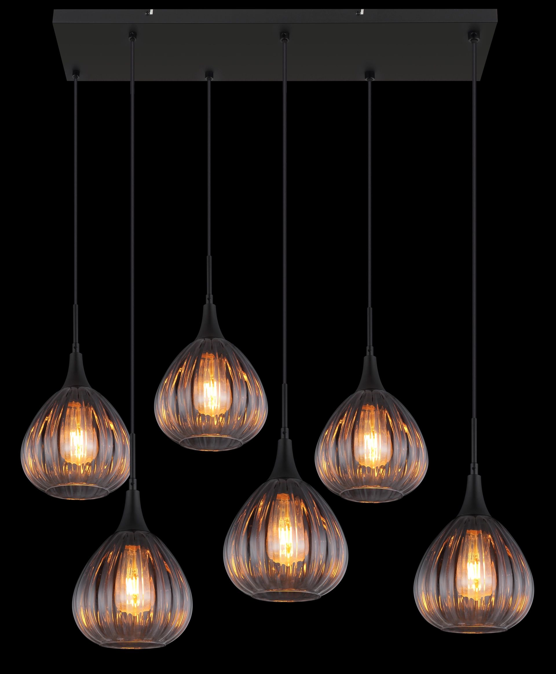 La lámpara colgante OLSEN aporta modernidad y elegancia a su interior. Con su forma rectangular y seis robustos colgantes, esta lámpara ofrece una base confiable para una iluminación ambiental. Las seis lentes de vidrio en forma de bola, que cuentan con surcos únicos, crean una atmósfera cálida y acogedora. El marco está fabricado en metal negro mate y las pantallas de la lámpara están hechas de cristal ahumado, claro y en degradé.