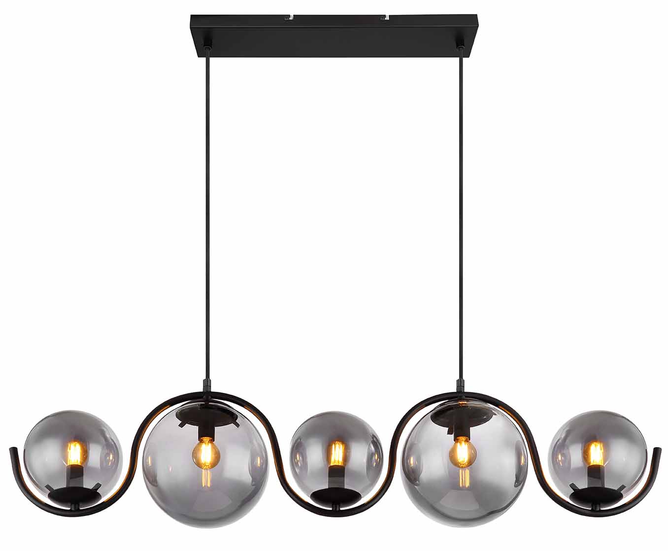 Experimenta el estilo refinado de esta extraordinaria lámpara de techo. Desde un punto de sujeción elegante, se extienden dos cables en negro mate hasta 1,2 metros, culminando en un marco de metal en forma de S que alberga cinco casquillos E14. Estos incluyen pantallas de vidrio ahumado bellamente diseñadas, dándote el poder de regular el color y la intensidad de la luz hasta una capacidad de 25 vatios a tu gusto. Debido a su excelente durabilidad y eficiencia energética, se recomienda el uso de bombillas LED.