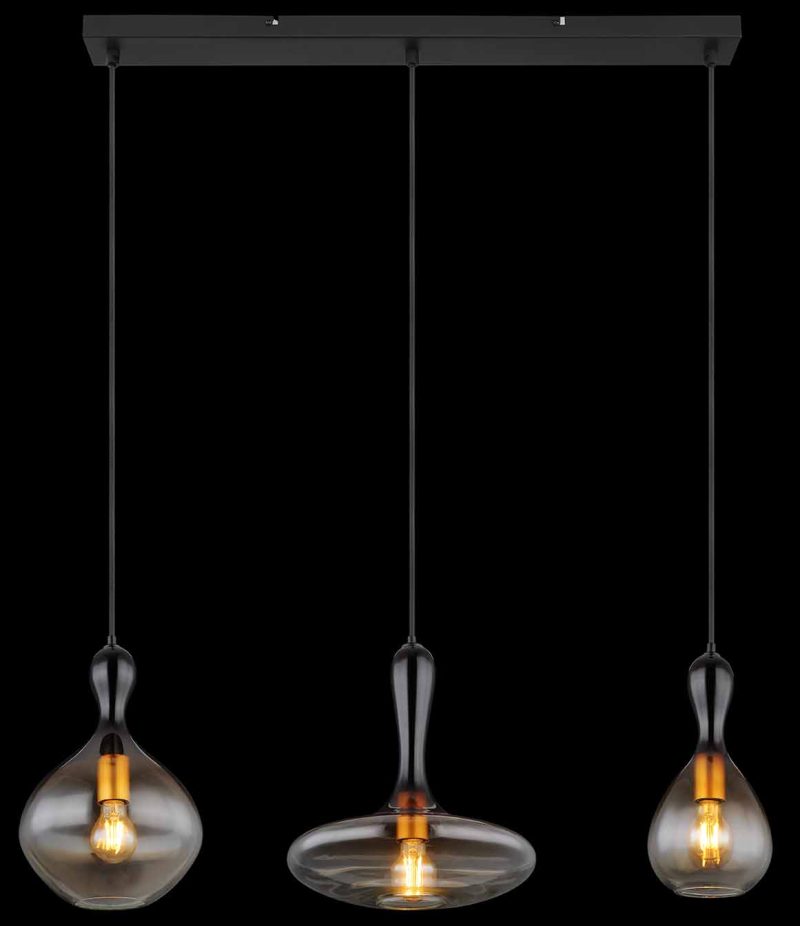 La lámpara colgante está hecha de metal en negro mate y oro cepillado, y vidrio en ahumado, ámbar y transparente. Tiene un cable textil negro y es ajustable en altura. Las dimensiones son LxBxH: 1015x330x1200 mm y los diámetros de vidrio son respectivamente 1 x 16,5 cm, 23 cm y 33 cm. El accesorio requiere 3 bombillas E27 con una potencia máxima de 40 W y un voltaje de 230 V, que no están incluidas. Esta lámpara colgante es un verdadero punto focal y hará que tu hogar brille con nuevo esplendor.