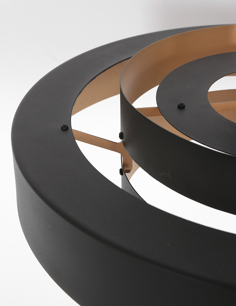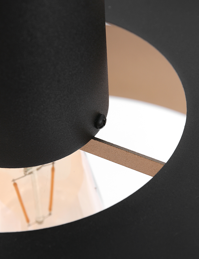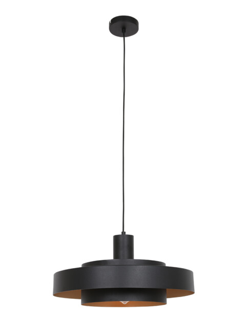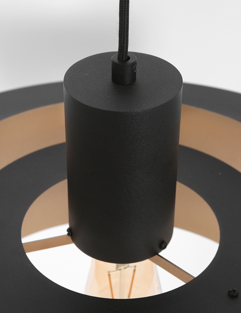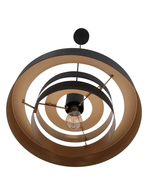 Elige esta lámpara colgante retro y cuélgala sobre la mesa del comedor o la mesa de café. Gracias a los delgados anillos con los que está compuesta la lámpara, tendrás una pieza que se integra perfectamente en tu interior. El color negro y el interior dorado aportan un acento llamativo al conjunto. La lámpara es ajustable en altura.