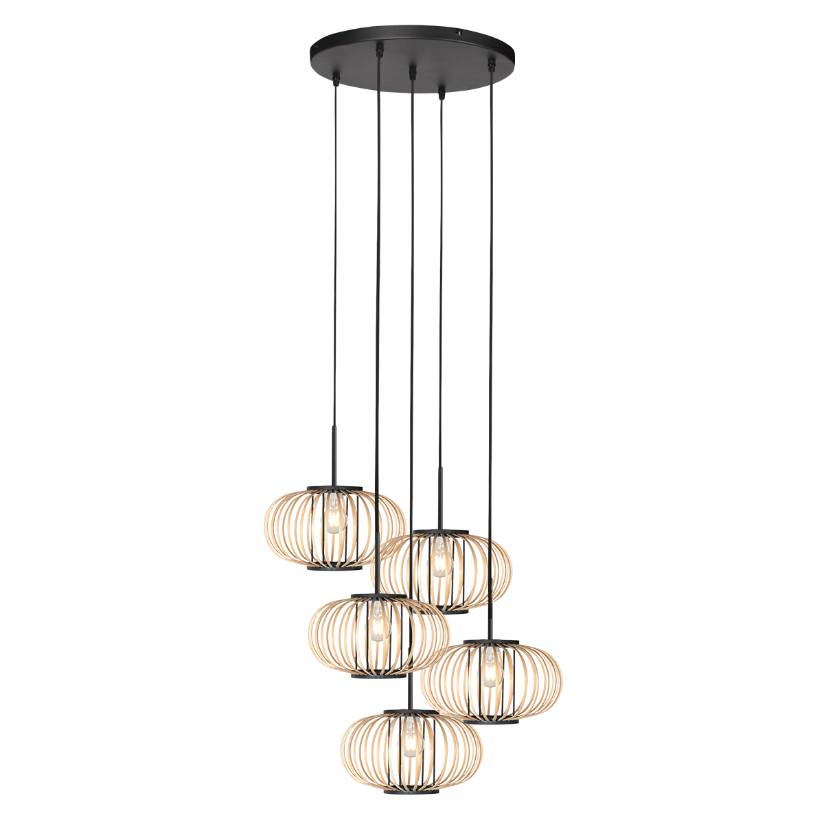 Esta lámpara de techo redonda negra con cinco puntos de luz se entrega en esta combinación con cinco pantallas de bambú compactas, creando un atractivo juguetón y natural sobre la mesa o en un vestíbulo. El armazón tiene cinco casquillos E27 en lujosos cables de plancha de hasta aproximadamente 320 centímetros de largo, lo que te permite colgar los puntos de luz a diferentes alturas. Esto hace que la lámpara sea ideal para espacios altos como un vestíbulo, un entrepiso o una hermosa entrada, pero también puede ser utilizada como lámpara de techo colgante cuando ajustas los cables a una longitud más corta.