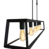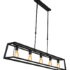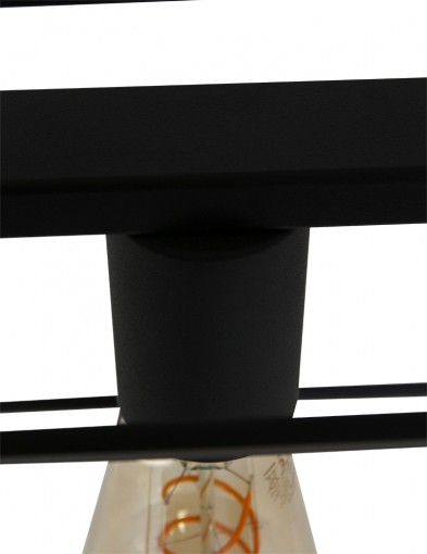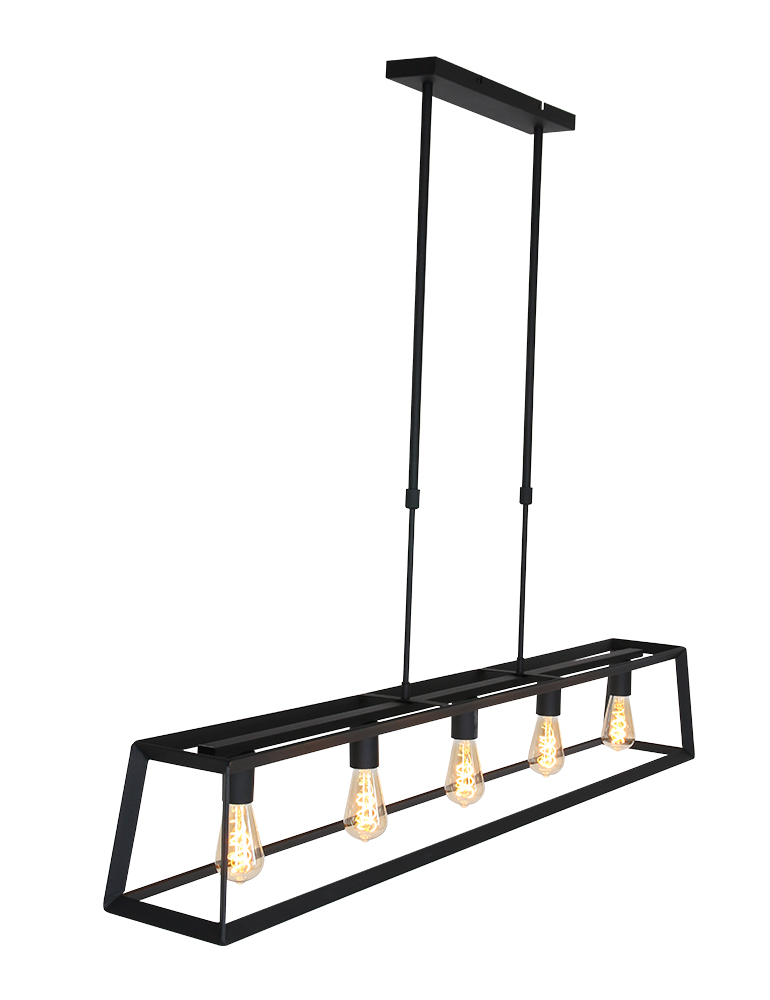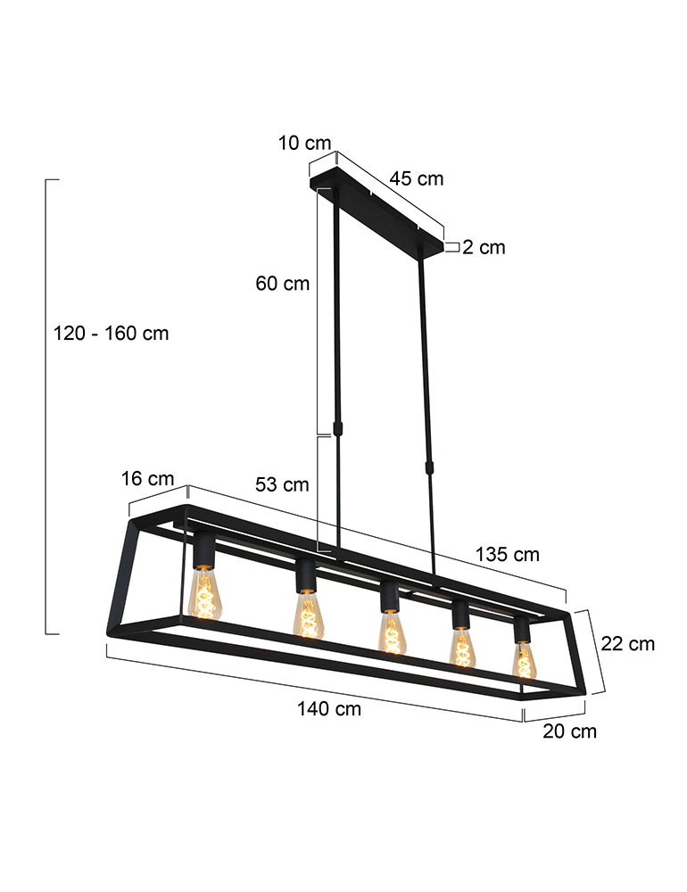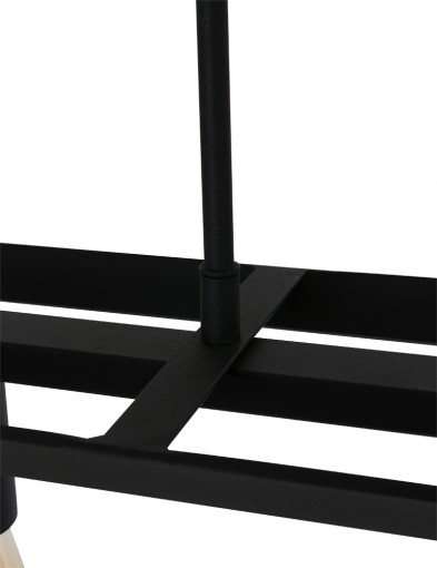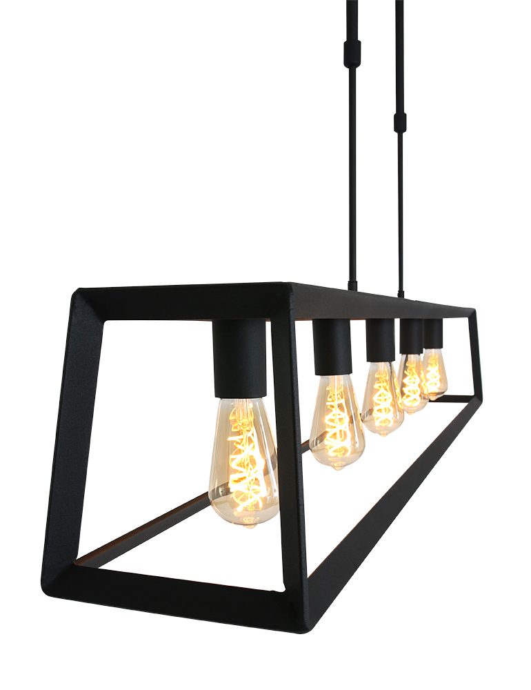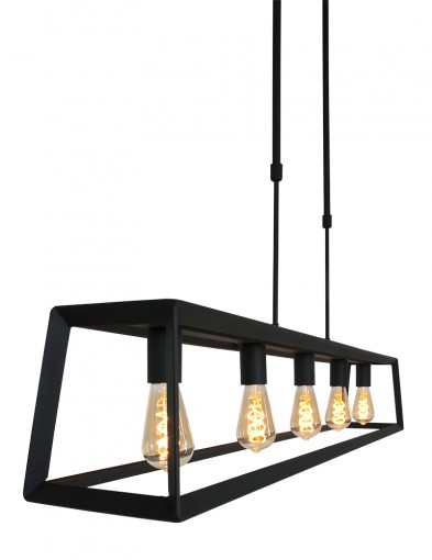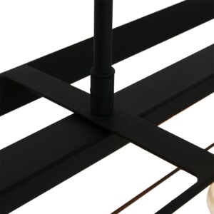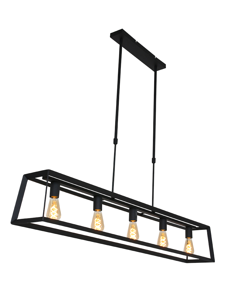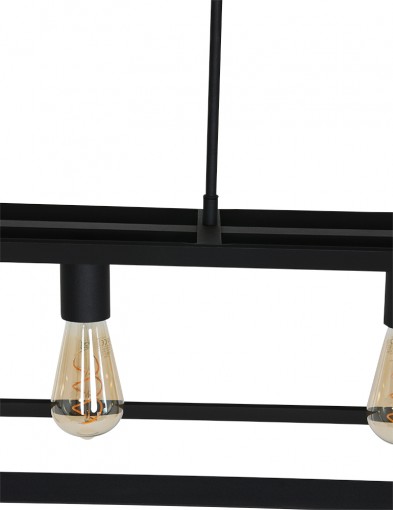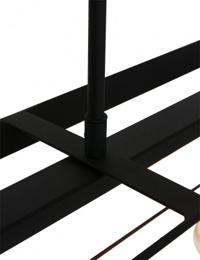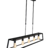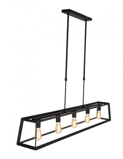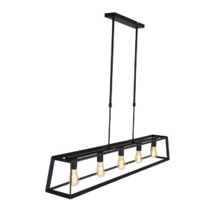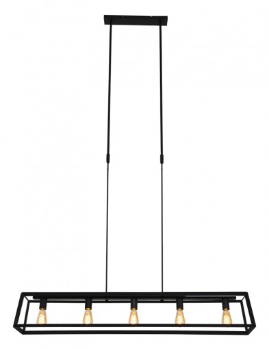 La lámpara colgante de la serie Buckley tiene un marco abierto robusto de metal negro mate y ofrece espacio para cinco bombillas E27 (no incluidas). Gracias a la construcción abierta, la luz se distribuye libremente en el espacio. La lámpara es ajustable en altura hasta un máximo de 145 cm y tiene un ancho y profundidad de 20 cm, con una longitud total de 140 cm. Apta para bombillas regulables y un regulador externo.