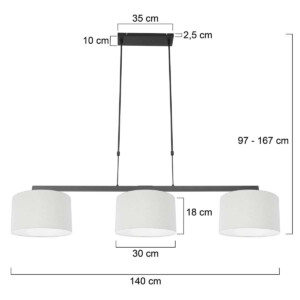 Las tres pantallas de lino grueso blanco de 30 cm le dan a la lámpara una apariencia contemporánea y crean una distribución de luz suave y atenuada. Perfecta para quienes aman un estilo atemporal, pero moderno en su interior. Esta lámpara colgante se entrega con 2 años de garantía.