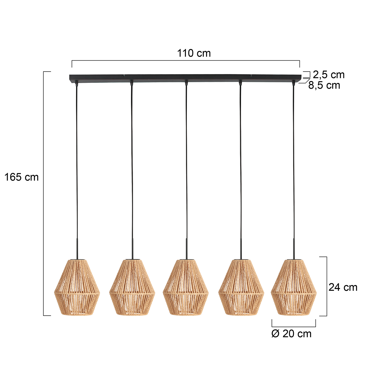 Esta lámpara colgante alargada de color negro con cinco puntos de luz se combina aquí con cinco pantallas de cuerda altas, creando una línea de luz juguetona y elegante sobre tu mesa de comedor o isla de cocina. El accesorio está equipado con cinco casquillos E27 en robustos cables de plancha de hasta 140 centímetros, lo que te permite ajustar la altura de cada pantalla de forma independiente. La placa del techo, que mide aproximadamente 110 por 8,5 por 2,5 centímetros, tiene un aspecto limpio y moderno y distribuye los puntos de luz de manera uniforme por la habitación.