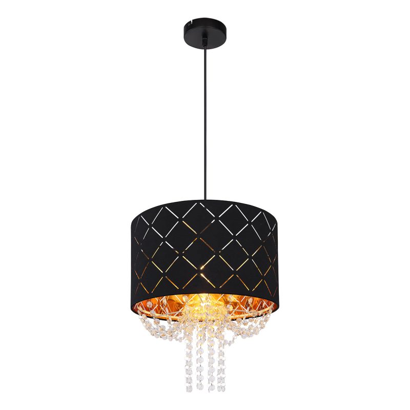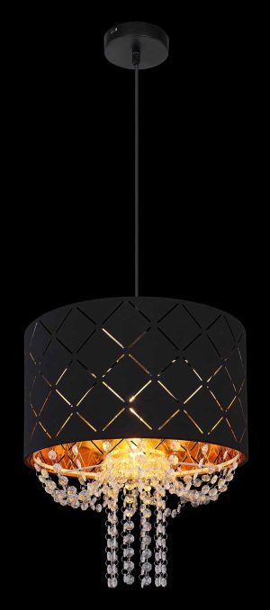 Descubre esta elegante lámpara colgante con exterior negro y interior dorado, adornada con cadenas de cristal que le dan un efecto de candelabro. El diseño moderno se combina con la elegancia clásica, perfecto para crear una atmósfera única en cualquier habitación.