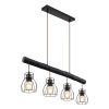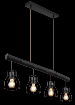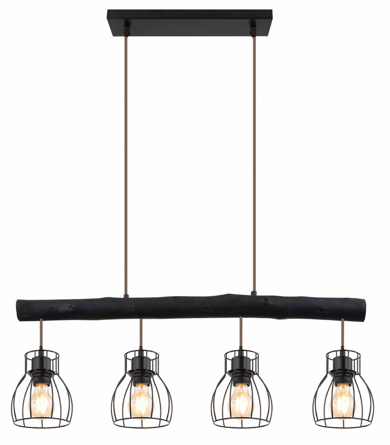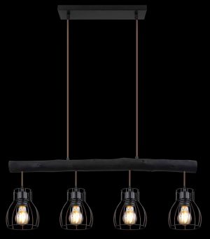 Esta lámpara colgante de la serie Mina es un elegante complemento para su interior. La lámpara de 82,5 cm de largo está compuesta por una barra de madera teñida de negro que cuelga del techo con dos cables, y cuatro pantallas metálicas negras de malla. Estas pueden equiparse con bombillas E27 a su elección, lo que le permite determinar el color y la intensidad de la luz. Altura ajustable hasta 140 cm. Combine con otros modelos de la misma serie.