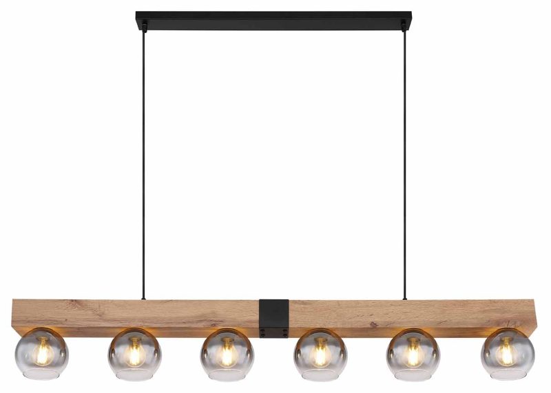 Esta hermosa lámpara de techo de la serie MOITAS inspira con un diseño espectacular. De un montaje rectangular negro en el techo salen dos cables negros de 1,2 m de longitud hasta un bloque en apariencia de madera (140×15 cm). Hay seis sockets E27, cada uno con una pantalla de vidrio en tonos ahumados. Con las conexiones E27, usted puede decidir sobre el color de la luz y la luminosidad hasta un máximo de 40 vatios.