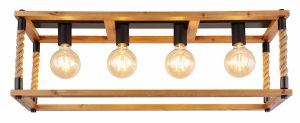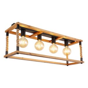 Esta hermosa lámpara de techo impresiona con su maravilloso diseño. En un marco de madera de 80×25 cm con decoraciones de cuerda de cáñamo, hay 4 casquillos E27 que cuelgan de dos cadenas a 1,2 m del techo. Con los casquillos E27, puede elegir libremente su fuente de luz, hasta un máximo de 60 vatios.