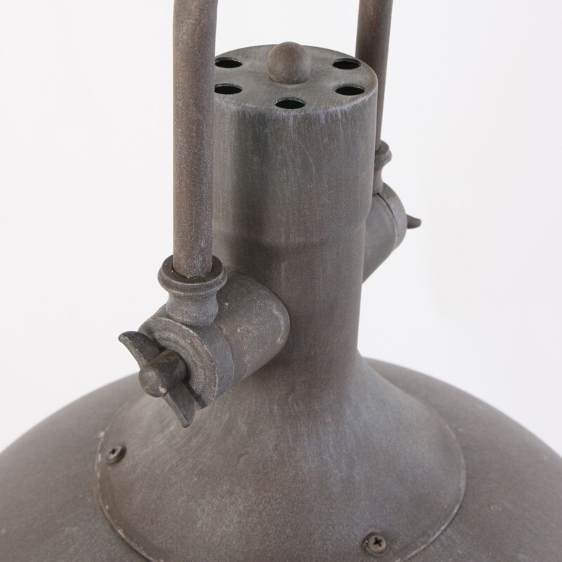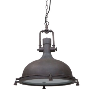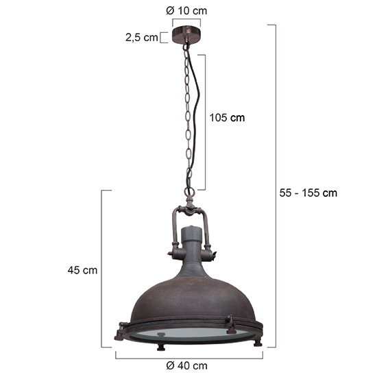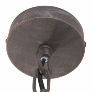 Lámpara colgante industrial rústica de la serie Eliga, acabada en marrón envejecido con una robusta cadena de 105 cm. La sólida pantalla de metal tiene un diámetro de 40 cm y una altura de 45 cm, lo que le da una apariencia llamativa. Adjustable en altura hasta un máximo de 155 cm y equipada con una base E27, adecuada para fuentes de luz de hasta 40 vatios. Ideal para sobre la mesa del comedor o como elemento decorativo en un interior industrial.