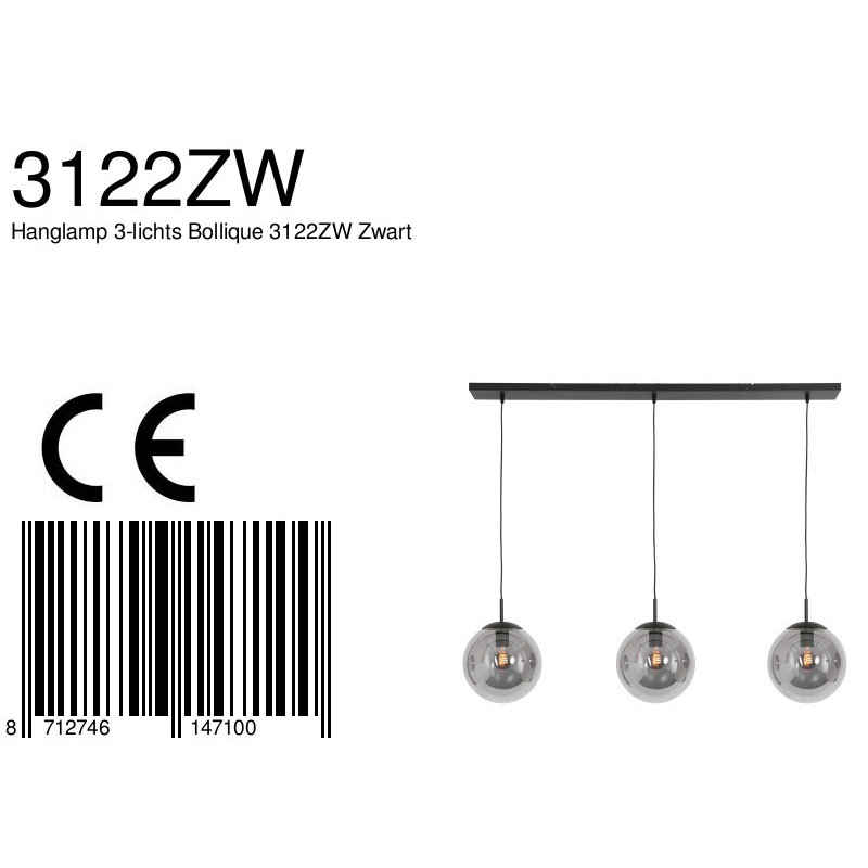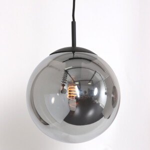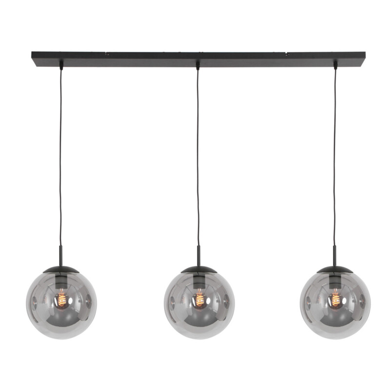 Aporta elegancia a tu interior con la lámpara colgante de tres luces Bollique. Tres grandes esferas de vidrio ahumado con un sutil reflejo cuelgan de una placa de techo de 120 cm de ancho. Equipadas con casquillos E27 y ajustables en altura entre 50 y 160 cm. La combinación de vidrio y tonos ahumados convierte esta lámpara en un atractivo ambiental.