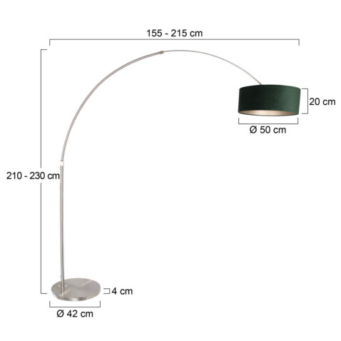 Esta elegante lámpara de arco combina lujo refinado con comodidad práctica. La pantalla de terciopelo verde irradia calidez y elegancia, mientras que el marco sutilmente curvado proporciona una apariencia aireada. Gracias al arco ajustable, puedes adaptar fácilmente la luz a tu espacio, lo que convierte a la lámpara en una adición tanto funcional como atmosférica.