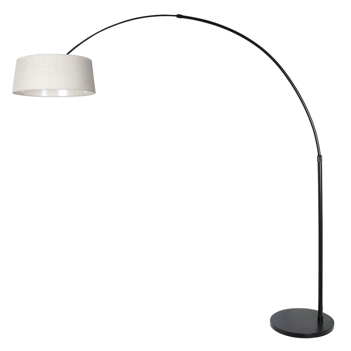 Este conjunto consiste en la lámpara de arco negra de la serie Sparkled Light combinada con la pantalla de lino color crema de 48 centímetros. El accesorio tiene un lujoso acabado negro, es ajustable de 210 a 240 centímetros y está equipado con un casquillo E27 inclinable para que la pantalla siempre cuelgue recta. Gracias al cable de 250 centímetros con interruptor de pie, puedes colocar la lámpara de manera flexible en cualquier espacio habitable.