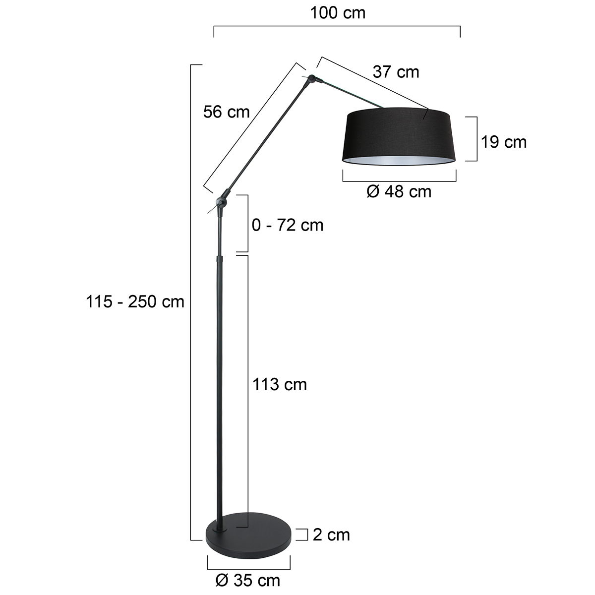 Esta combinación consiste en la lámpara de arco negra de la serie Prestige Chic, junto con la pantalla de lino negra de 48 centímetros. El accesorio cuenta con un brazo articulado ajustable, una sólida construcción de metal y un casquillo E27 inclinable para que la pantalla siempre cuelgue recta. El cable de conexión de 220 centímetros está equipado con un interruptor de pie para mayor comodidad.